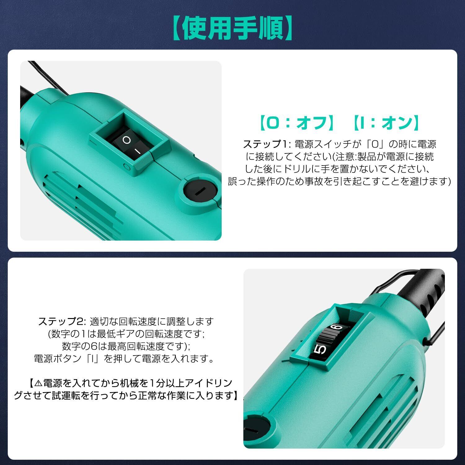 【使用手順】「O:オフ;I:オン。」ステップ1:電源スイッチが「O」の時に電源に接続してください(注意:製品が電源に接続した後にドリルに手を置かないでください、誤った操作のため事故を引き起こすことを避けます);ステップ2:適切な回転速度に調整します(数字の1は最低ギアの回転速度です;数字の6は最高回転速度です);電源ボタン「I」を押して電源を入れます。