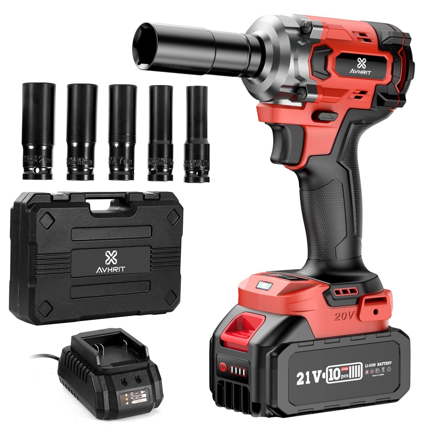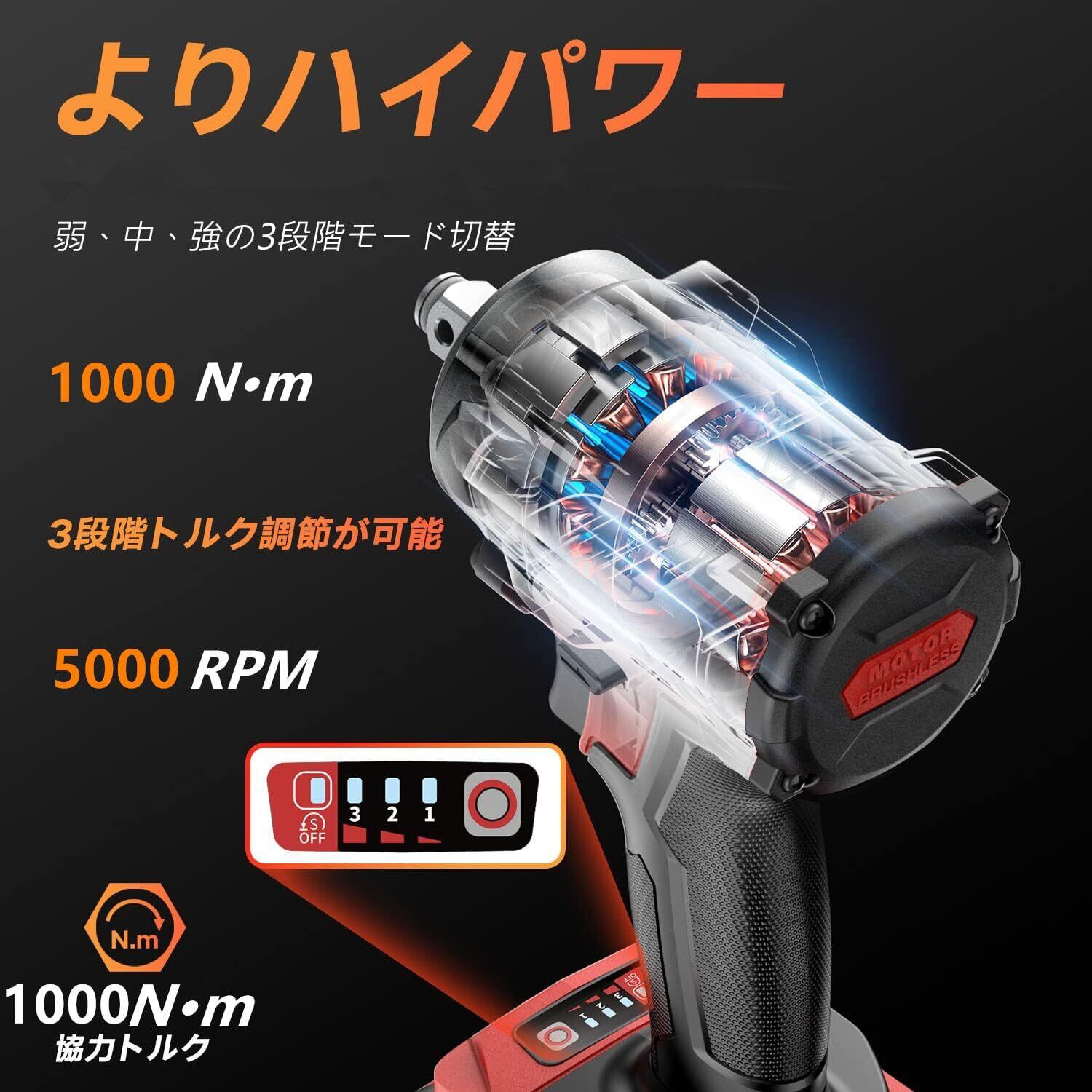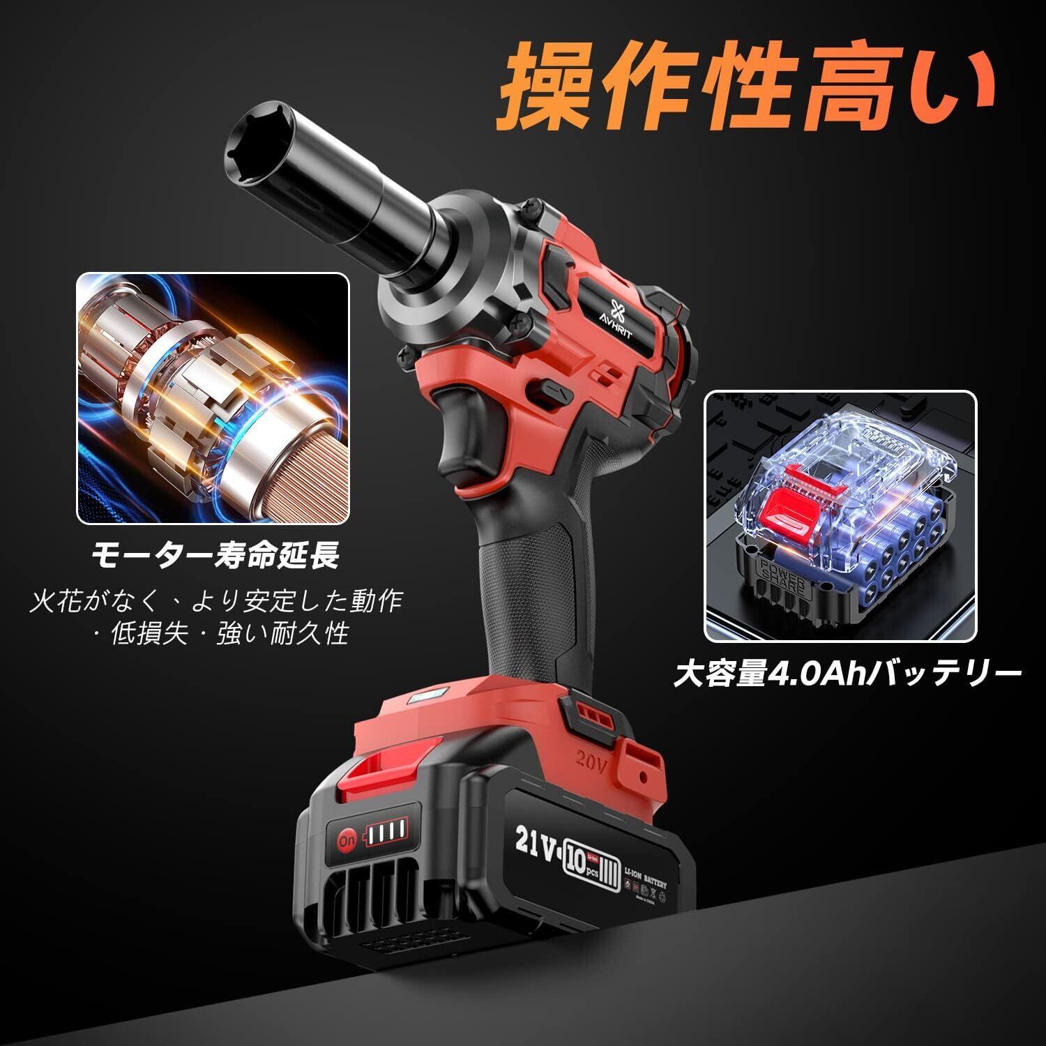 【2025年新登場】Avhrit 電動インパクトレンチ 強力 1000N·m コードレス インパクトレンチ 1/2"トルクレンチ ブラシレスモーター 4000mAhバッテリー付き 5本のソケット付属 正逆転両用 3段階トルク調整 自動停止モード LEDライト付き タイヤ交換 ナットやボルトの締め付け・緩め 日本語説明書付き
