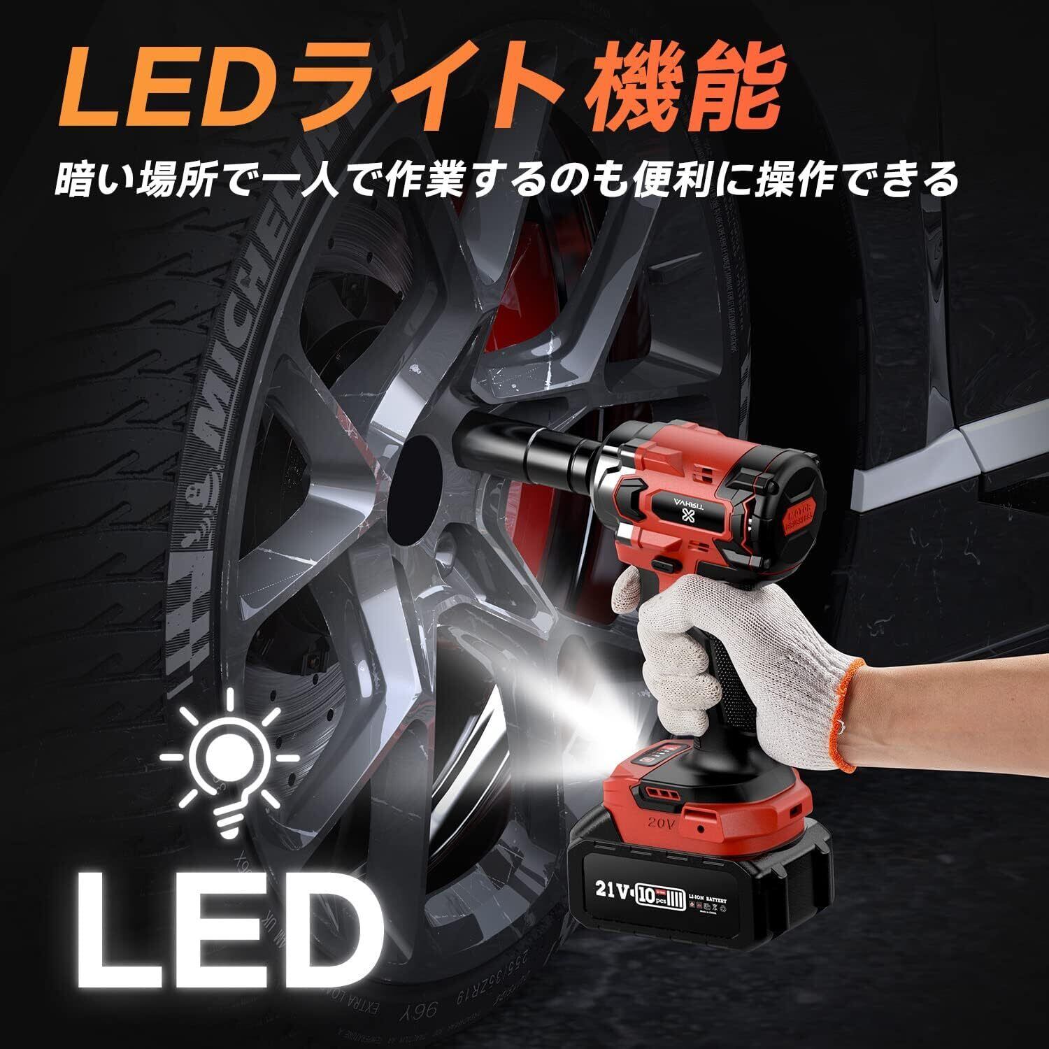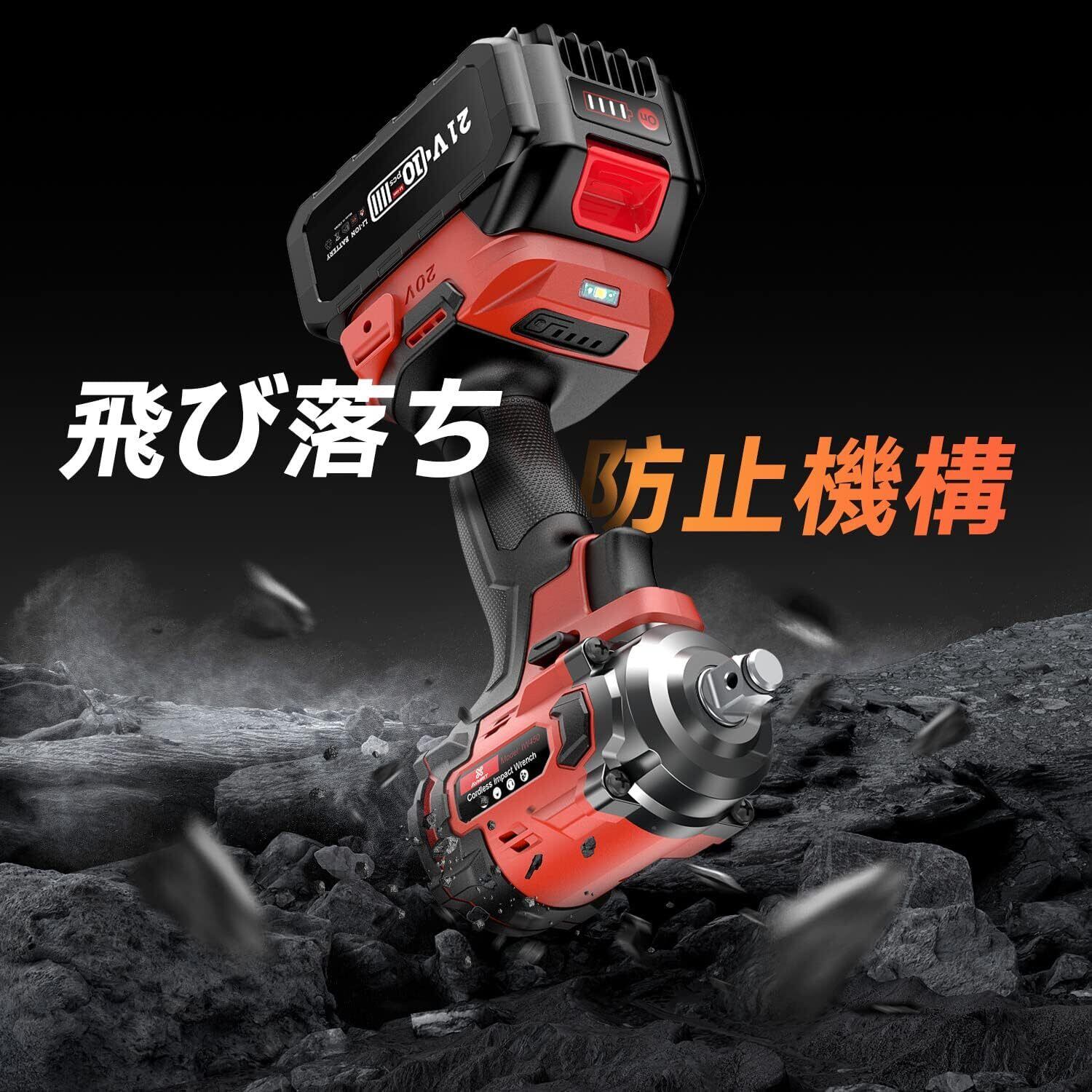 【ブラシレスモーター&より高い耐久性】この充電式インパクトレンチは、アップグレードされたブラシレスモーターを搭載し、通常のモーターや純銅製モーターに比べて寿命が2倍、効率が3倍に向上しています。また、この電動インパクトレンチは、高エネルギー消費量と高騒音の問題に重点を置き、アップグレードされた製品は高効率、低消費電力、安定性、低騒音を実現しています。電動インパクトレンチをお探しの方には特におすすめです。
