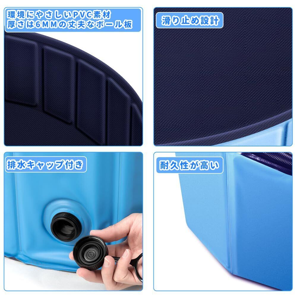 【型崩れしないペットプール】2層のPVC素材の中では厚さは6mmの丈夫なボール板が内蔵していて、従来品より壁を支える部分を厚くしたことで安定感抜群、プールの型崩れの心配もありません。安全無毒のPVC材質を採用し、お子様が舐めても安心します。
