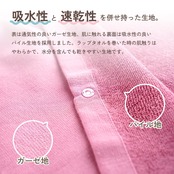 【吸水速乾・簡単お洗濯】 表は通気性の良いガーゼ生地、肌に触れる裏面は吸水性の良いパイル生地を採用しました。 タオル生地で出来ているのでご自宅の洗濯機でジャブジャブ洗えます。 片面がガーゼ生地なのでとても乾きやすく梅雨の時期の部屋干しでも安心。 綿100%の生地はお肌に優しい質感で、体に巻くと水分をしっかり吸水してくれます。