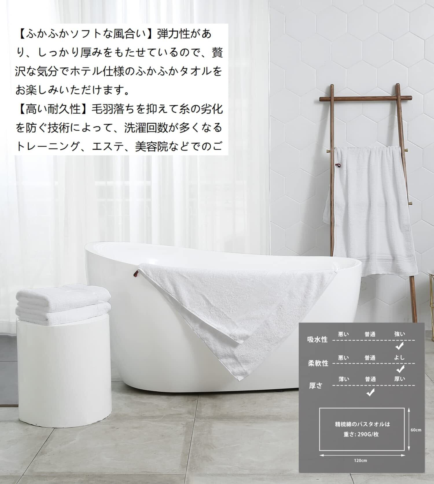 【高品質の綿バスタオル 4枚セット】サイズ:約60×120cm、重量:約290g ,このバスタオルは、綿糸の中でも最高級の「コーマ綿」繊維を使用しており、長繊維を丁寧に加工することで、柔らかくしっとりとした肌触りを実現しました。掉毛が少なく、長期的な使用にも耐えられます。洗濯しても毛羽立ちが少なく、清潔感を保ちやすく、長くお使いいただけます。