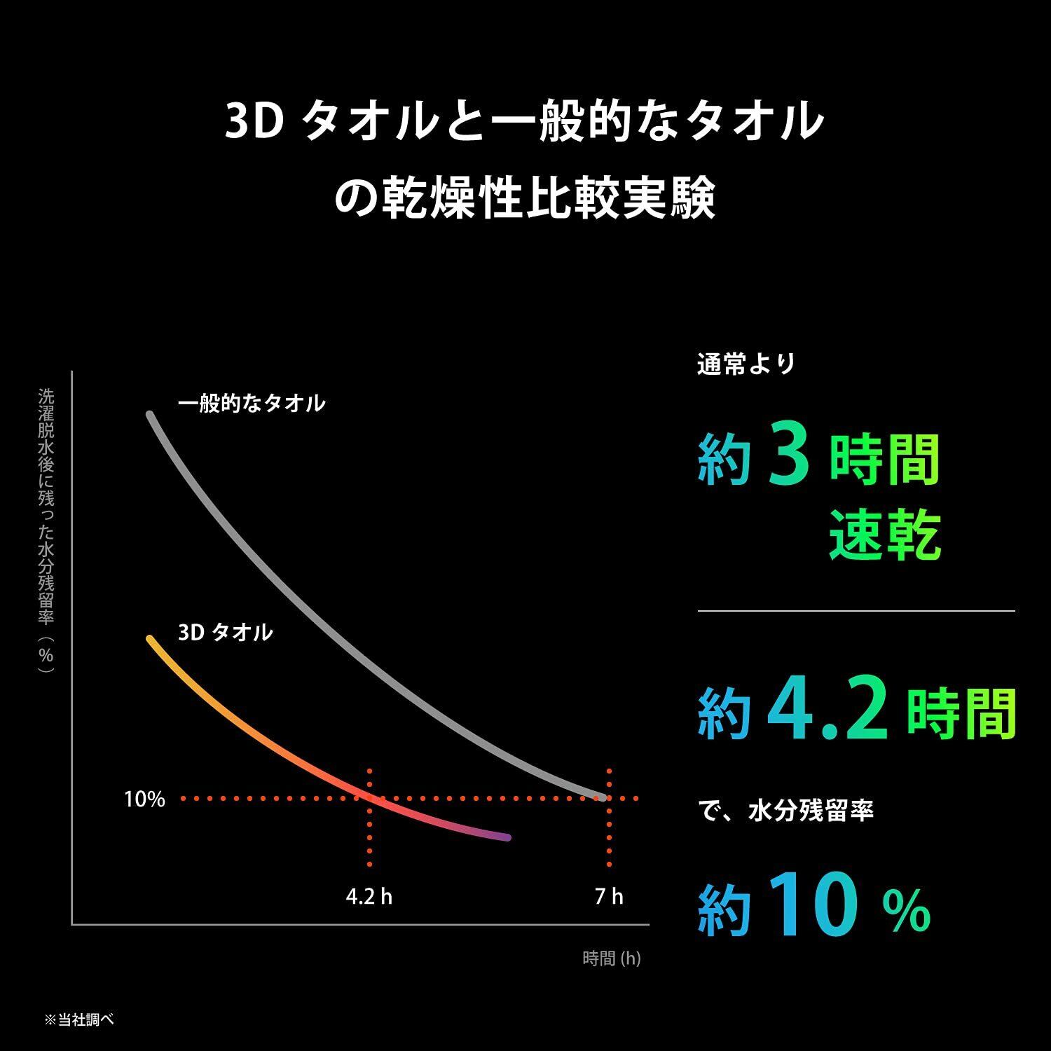 【速乾≠薄っぺらい】これまで、吸水性や速乾性を求めたタオルは、ポリエステル素材の独特なまとわりつくような肌触りを持つもの、または、薄手のタオルにするといった方法が一般的であり、なにかを犠牲にしなければ高い吸水性や速乾性は両立できませんでした。そこで我々タオル研究所は、タオルとして本来の技術向上を目標とし、柔らかいタオルならではの風合いを維持したまま、吸水性・速乾性を持ち合わせるタオルを消費者の方へ届けたいと考え、従来品と一線を画す、この[スピードドライ 3D]#009シリーズを開発しました。