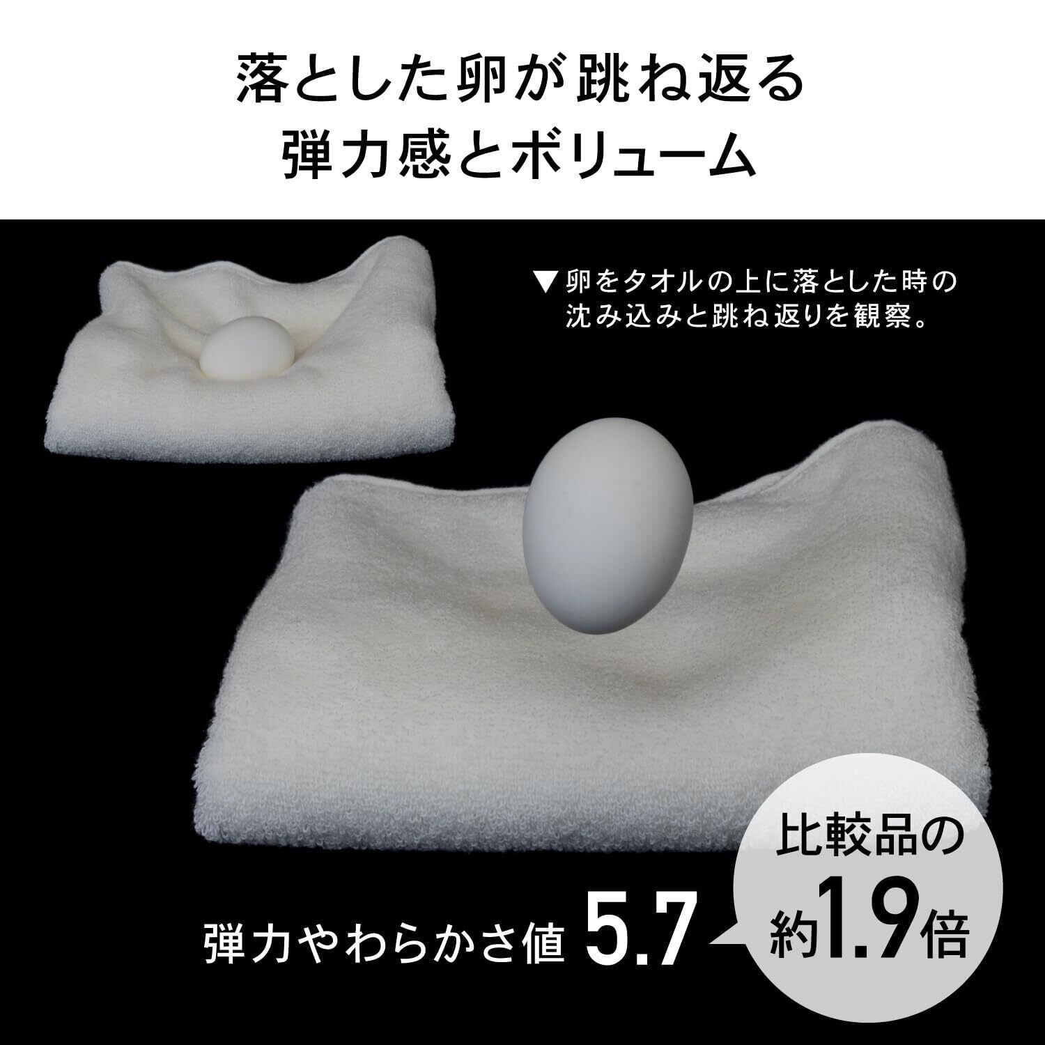 【パイル弾力を活かしたスポンジータッチ】ホームユースのタオルに新視点を導入。スプリングやスポンジから着想を得て、バネのような反発力を生む糸構造を開発。タオルの上に落とした卵が跳ね返る弾力感とボリュームを持ったタオルが完成しました。