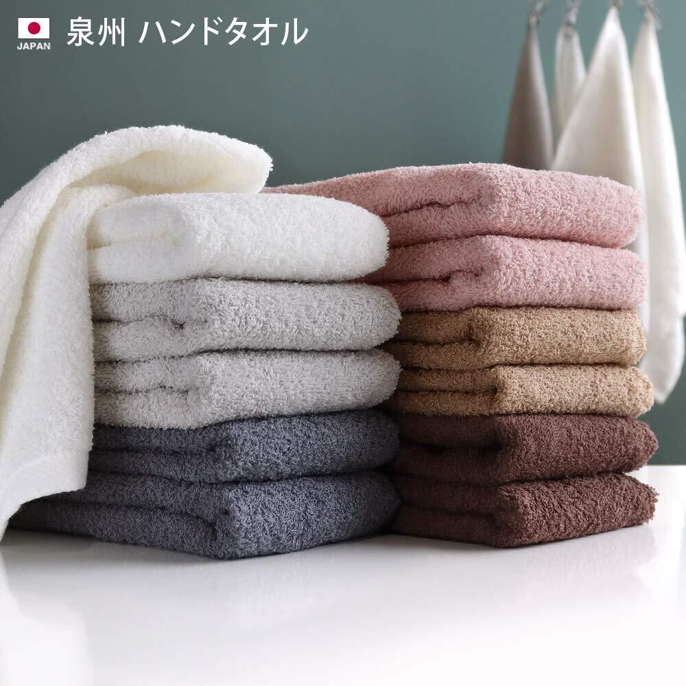 【ハンドタオル 10枚セット】生産地:日本(泉州タオル) サイズ・重さ:約34×36cm・約38g(おしぼりサイズ) 素材:綿100% カラー:ホワイト、ブルーグレー、モカ、ダークブラウン、モスピンク、ライトグレー、グレーベージュ、ブルー、ダークグレー、ネイビー セット内容:ハンドタオル 同色10枚