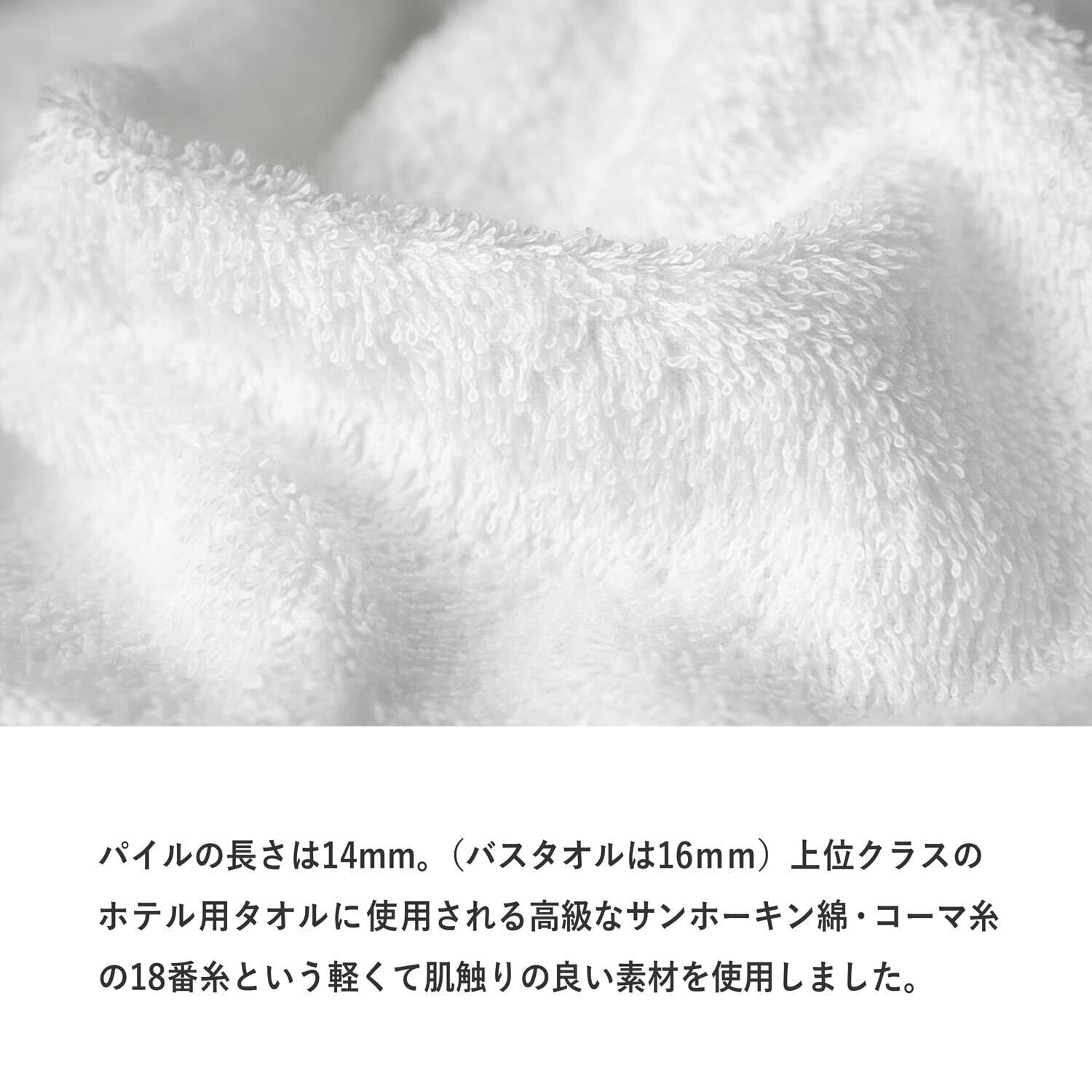 ・アメリカ合衆国カリフォルニア州のサンホーキン地方で栽培された綿花 「サンホーキン綿」という良質綿を使用したホテル仕様のタオルです。 中でも上位クラスのホテル向けに使用される【サンホーキン・コーマ糸の18番糸】をパイル糸に使用。 14ミリという長めのパイルで、パイルの間に空気を織り込んだようなふんわり感が特徴です。