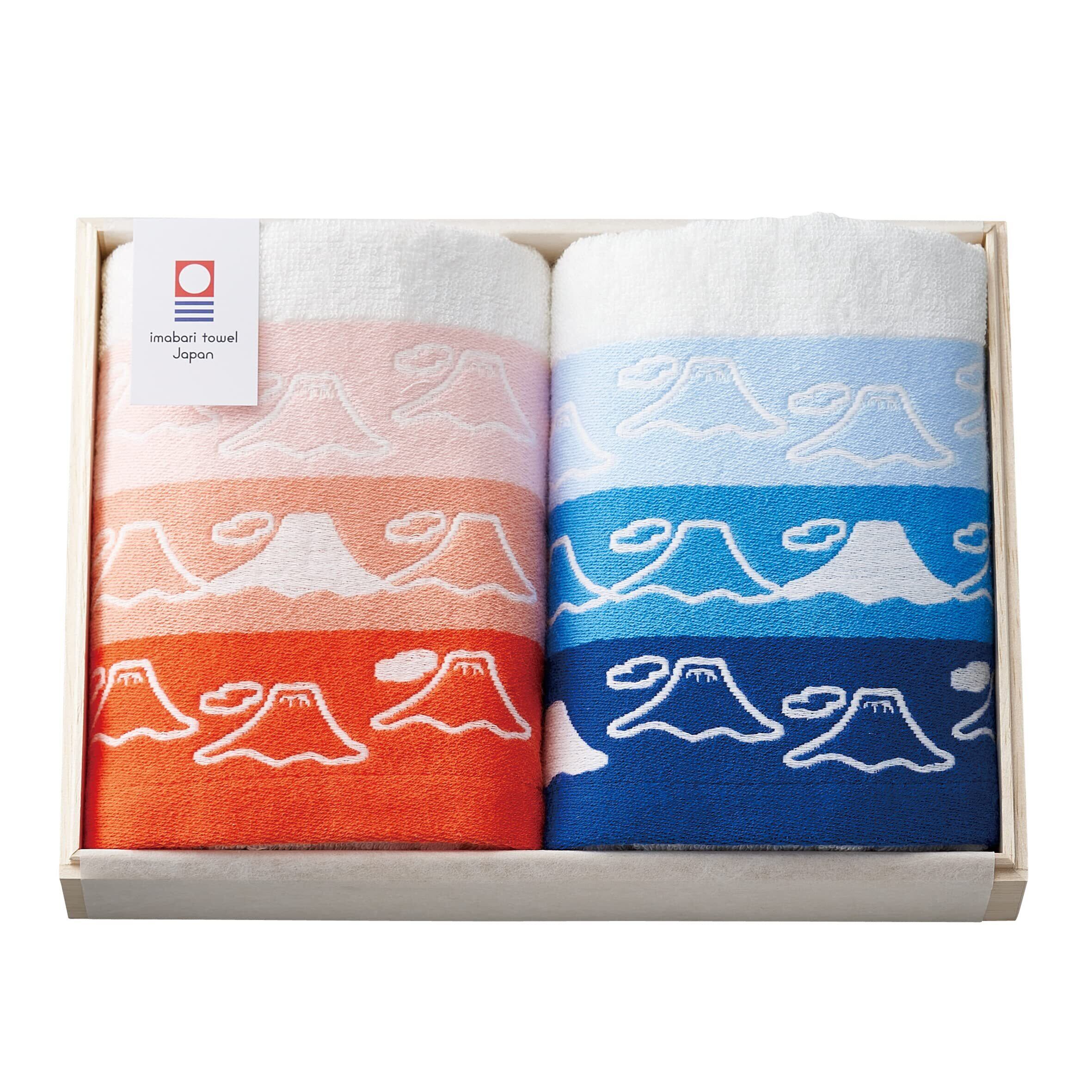 壮大な青富士と縁起の良い赤富士、2色の日本の象徴「富士山」がデザインされた今治タオルのセットです。