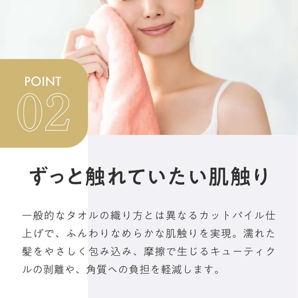 【ぴったりサイズ】(長辺)約85cm(短辺)約38cm(厚み)約0.6cm。フェイスタオルより長く、バスタオルよりも小さい、髪をケアするのにぴったりなサイズ。もうろうが多い方やロングヘアの方は、タオルサイズも悩みどころ。フェイスタオルでは小さくてすぐ外れてしまうし、かといってバスタオルは重い。そんな方でも使いやすいサイズに仕上げました。