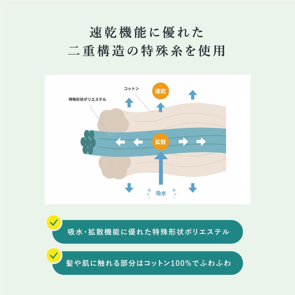 吸水・拡散機能に優れた特殊形状ポリエステルをコットンでカバーリングする二重構造の糸を使用することで乾きやすさを追求しながら、肌に触れる部分は「コットン 100%」の安心感を持ってお使いいただけます。