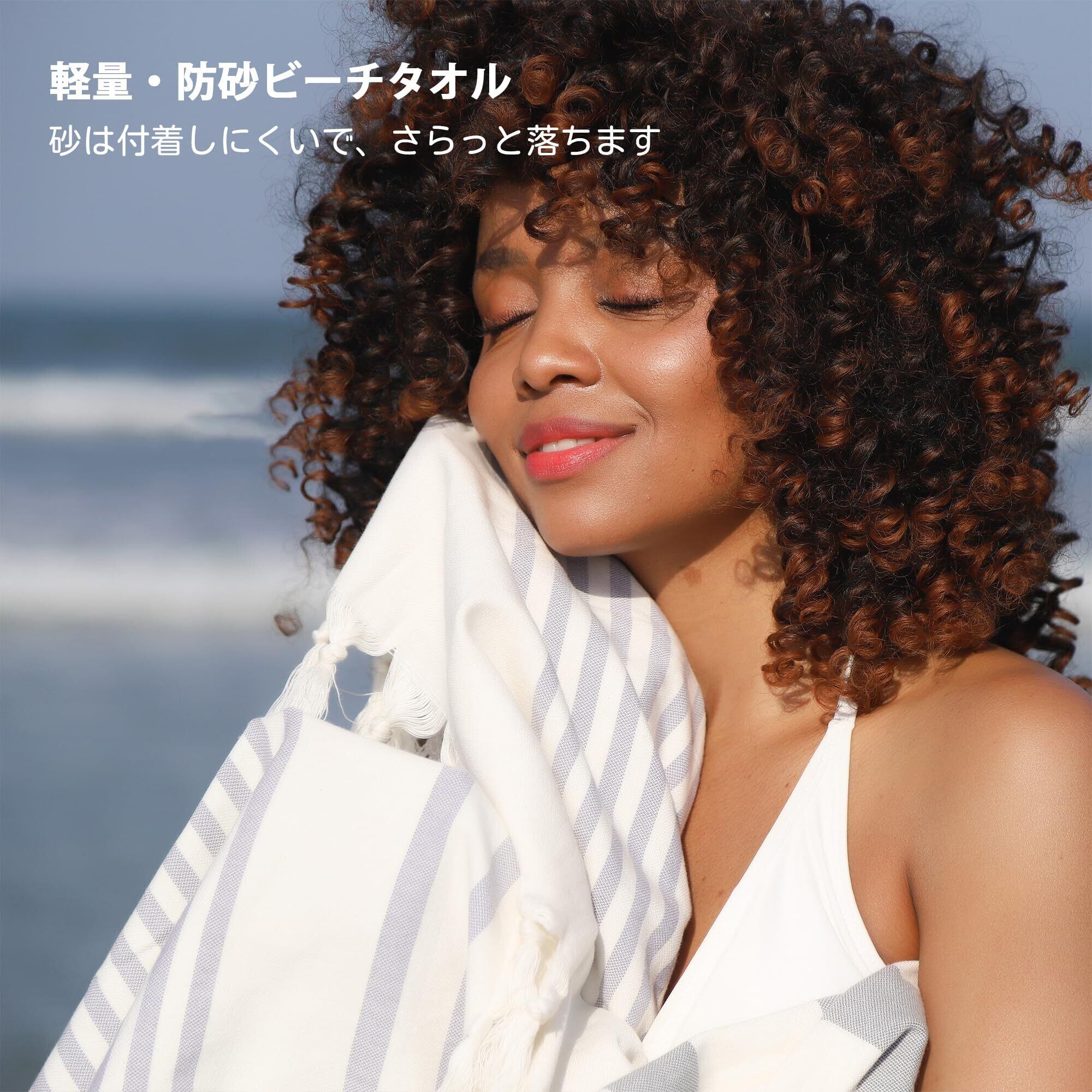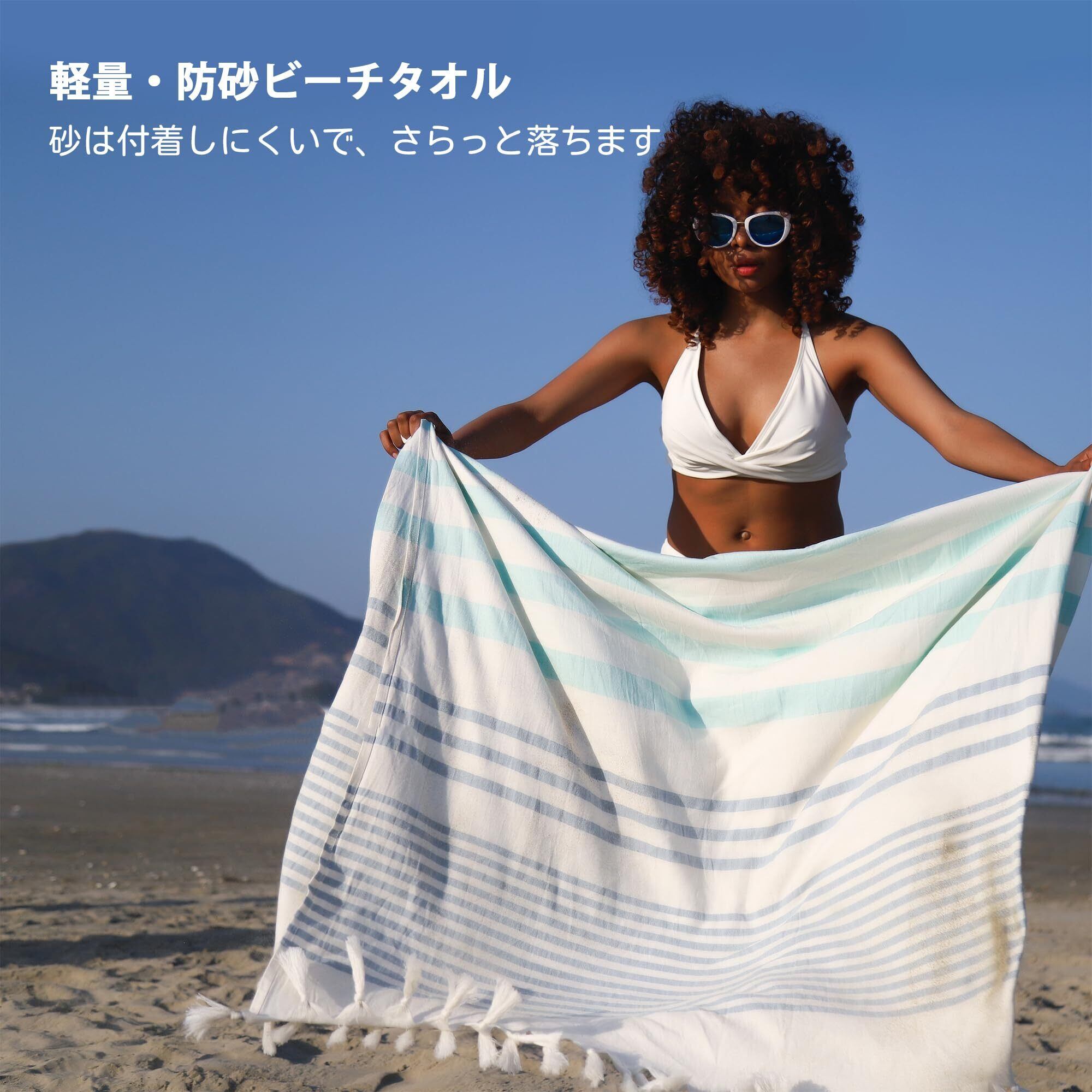 【素晴らしい天然素材】吸水速乾に優れた綿とレーヨン(竹繊維)混紡された素材はシルクのようなしっとり滑らかな肌触りで、ほんのりひんやり温度感もあり、ふわふわで、やわらかい。摩擦が少なく、静電気はほとんど発生しない、ほかの繊維にはない天然抗菌力と天然消臭力が持っています、敏感肌、肌の弱い方におススメです。タオルはストライプ柄で薄手タイプ、両サイドにフリンジが施されています。小さく丸めてビーチバッグに収納できます。ビーチ旅行に最適です。