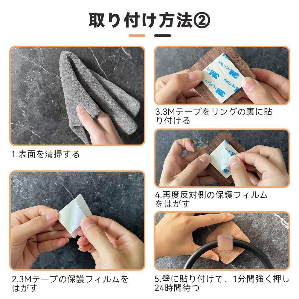 【2つの取り付け方法】方法一:タオルリングの裏面に接着剤を塗って、壁に貼ります。ボンドが固まるまで保持用壁の補助ステッカーをかるく接着し、1分間強く押してください。72時間待って接着剤を十分に乾燥させます。補助ステッカーをはがして、インストール完了します。方法二:強力両面3Mテープの保護フィルムをはがし、壁に貼り付けて、1分間強く押してください。耐久性を確保するため、24時間お待ちください。