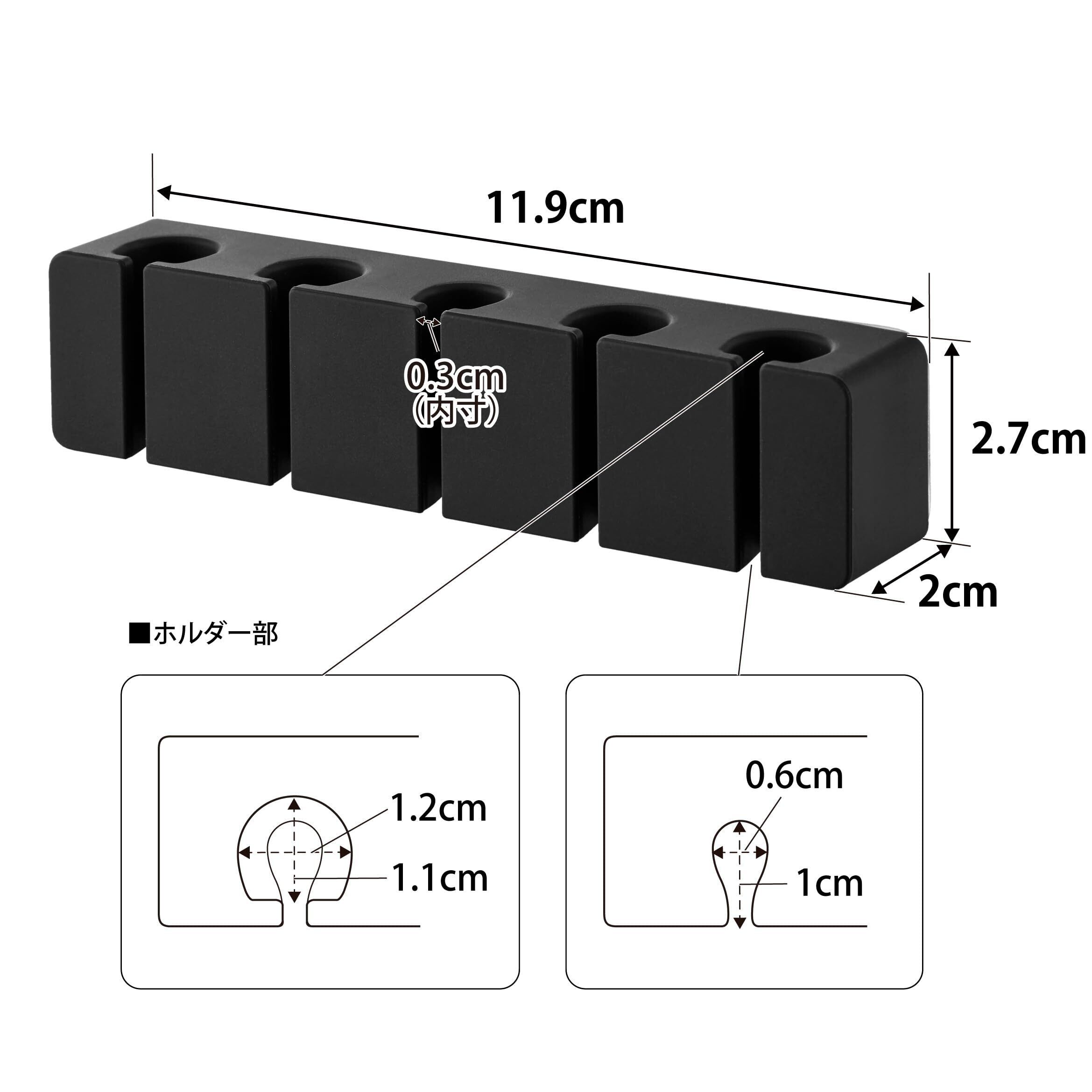 商品サイズ:W11.9×D2×H2.7cm(フィルムフック含まず) フィルムフック接着面: W12×H2.7cm ▪商品重量:55g ▪内寸 ホルダー部1つあたり:W1.2×D1.1cm(前面差し込み口:W0.3cm)