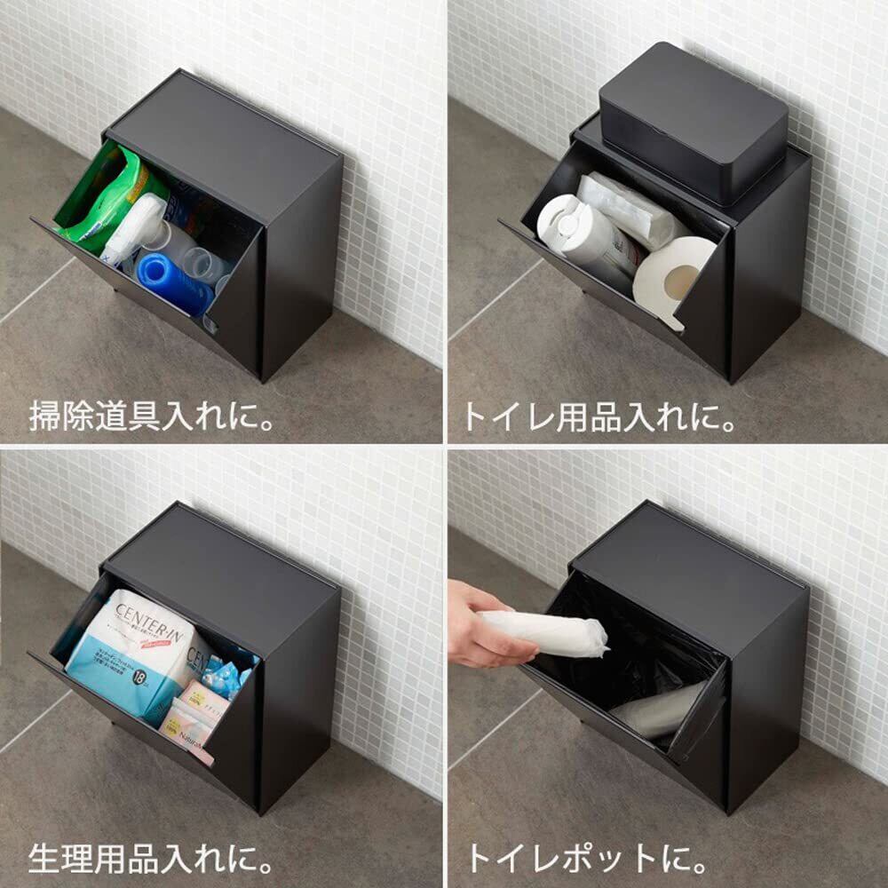置いても壁にかけても使える。見せない収納で清潔なトイレポット&収納ケース2個セット トイレブラシやお掃除用品洗剤、トイレットペーパーなどを隠して一括収納できる便利な収納ラックのご紹介です。 収納以外にも、存在感を消したいトイレポットとしても。生活感の出てしまいがちなゴミ箱も、インテリアにスッと溶け込みます。 天板にはディスプレイスペースとして、アロマや消臭剤を置いたり、お気に入りの雑貨を飾って楽しい空間を演出。 使う度に"いいな"と思える、上品でスッキリしたトイレ空間を作っていただけます。 カラーは選べるホワイトとブラックの2色展開。 複数使いにもオススメな、省スペースにおける多機能なトイレラックです。 ※2個セットの販売になります。