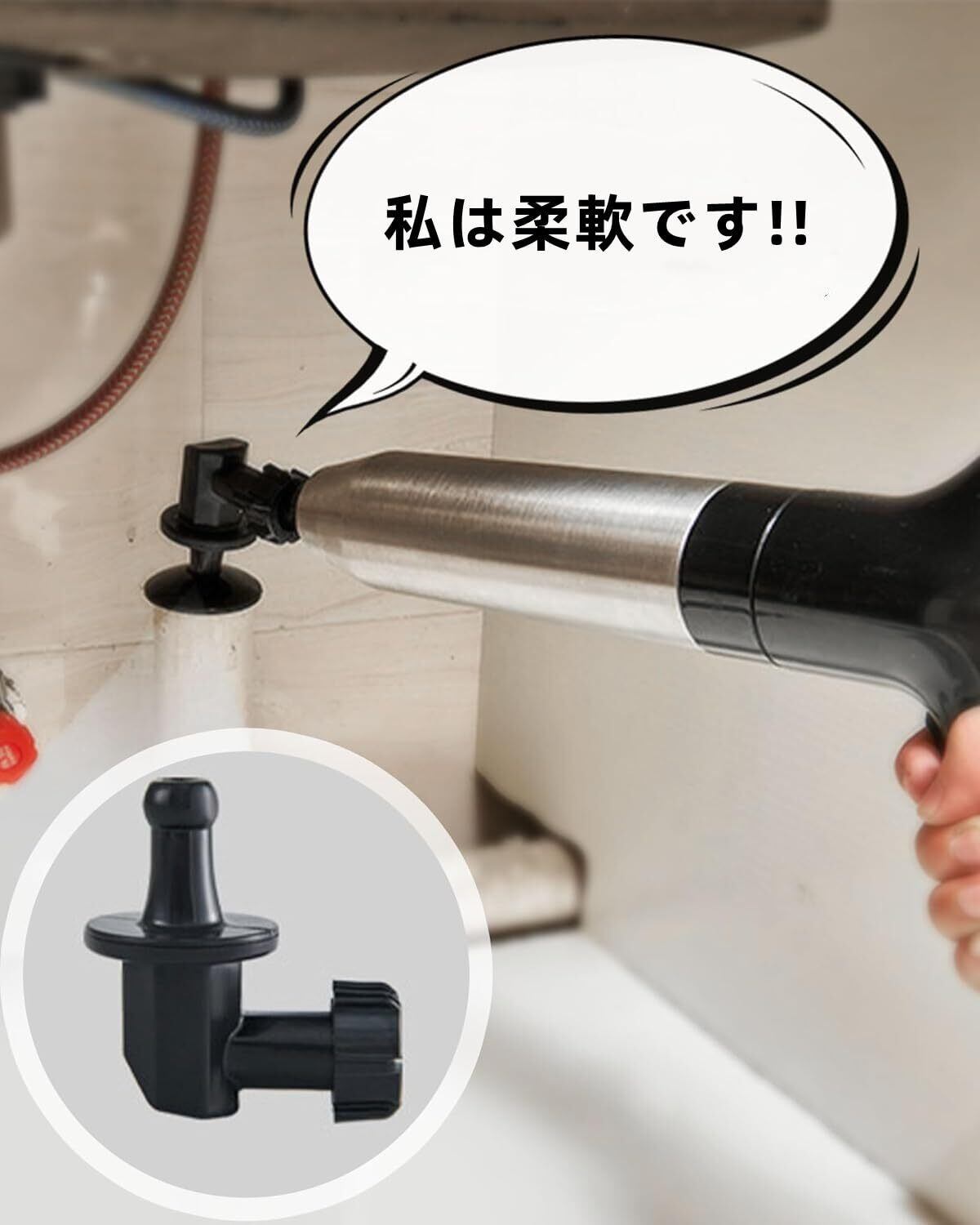 【多機能用途】高圧ドレインプランジャーは4種類の異なるアンロッカーヘッドが付属しており、状況に応じてヘッドを交換できます。トイレ、浴室のバスタブ、シャワー、キッチンのシンク、洗面台、和式便器、床排水口、詰まった配管など、さまざまな場所で使用可能です。ゴミ、髪の毛、布などによる詰まりを、高圧空気の力で数秒で解消できます。