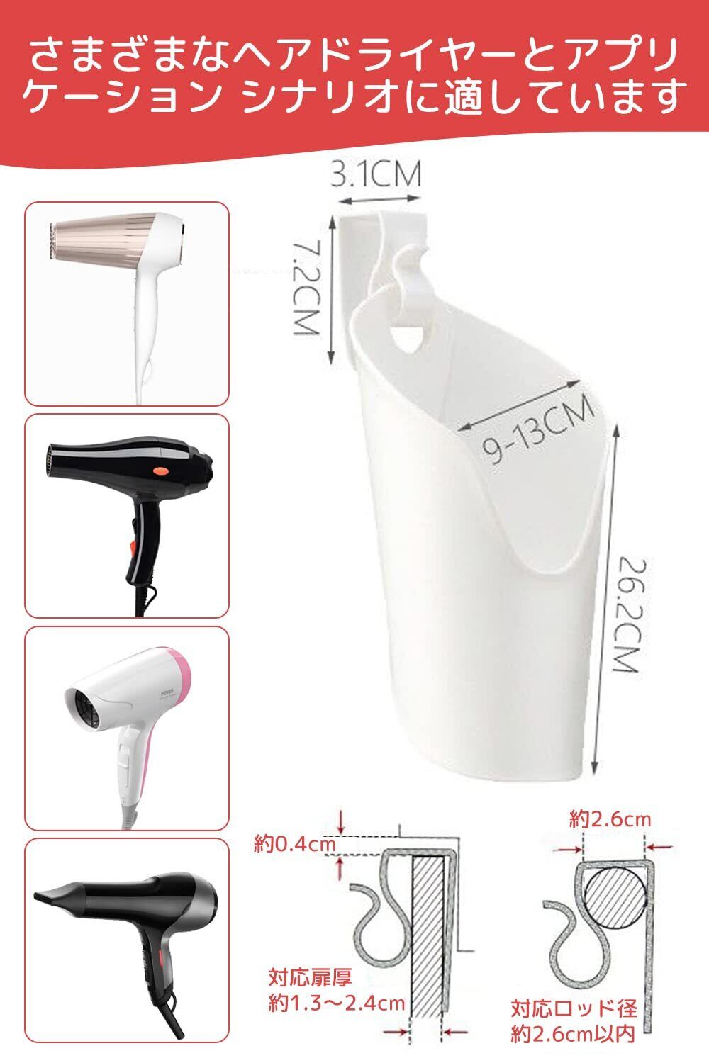 【幅広い適用性】ドライヤー収納は、さまざまなサイズのヘアドライヤーに適しており、荷重容量が良好です。 そのフックは、厚さが1.3〜2.4cmの厚さ、または直径2.6cm以内の水平ロッドの木製ボードに適しているため、ベッドルーム、バスルーム、キッチン、ホテルで使用できます。