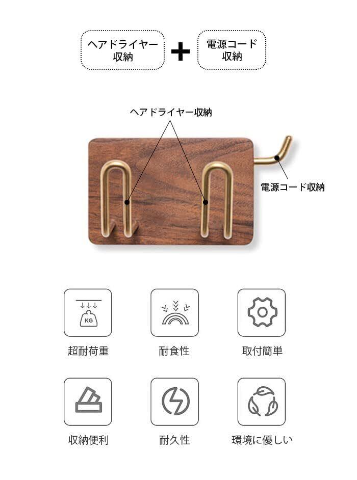 Usumairu ヘアドライヤーホルダー ドライヤーホルダー 壁掛け式 ブラッククルミ木製 電源コード収納付き ヘアドライヤーホルダー ブラケット木製収納棚オーガナイザー おしゃれ 天然木 (12cm, ウッド)