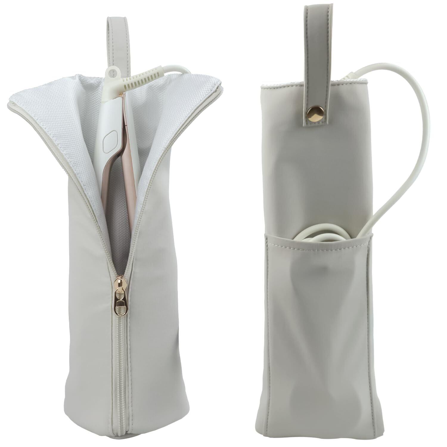 ヘアアイロン ケース 収納 【使ってスグ収納】ヘアアイロンポーチ 耐熱 300度 吊り下げ 持ち運び 可愛い ミニア 旅行 耐熱素材 コード収納ポケット付き (ライトグレー)
