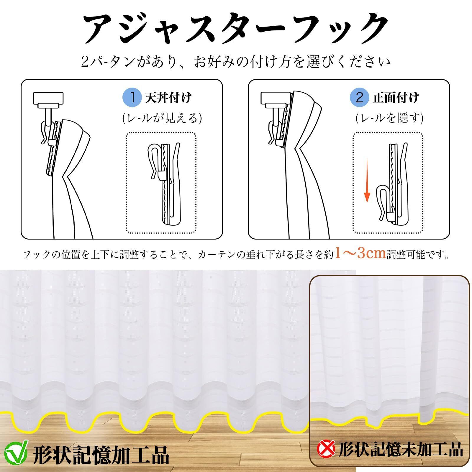 お手入れ便利:洗濯機で丸洗い可能なので、お手入れは簡単です。自巻きのヘム仕様、洗濯の後でも、裾がばらばらにならなく、美しい垂れ下がり感を维持します。ドレープを美しく見せるアジャスターフックの设计、取り付けは便利で、1-3cmの高さを调节することができます。