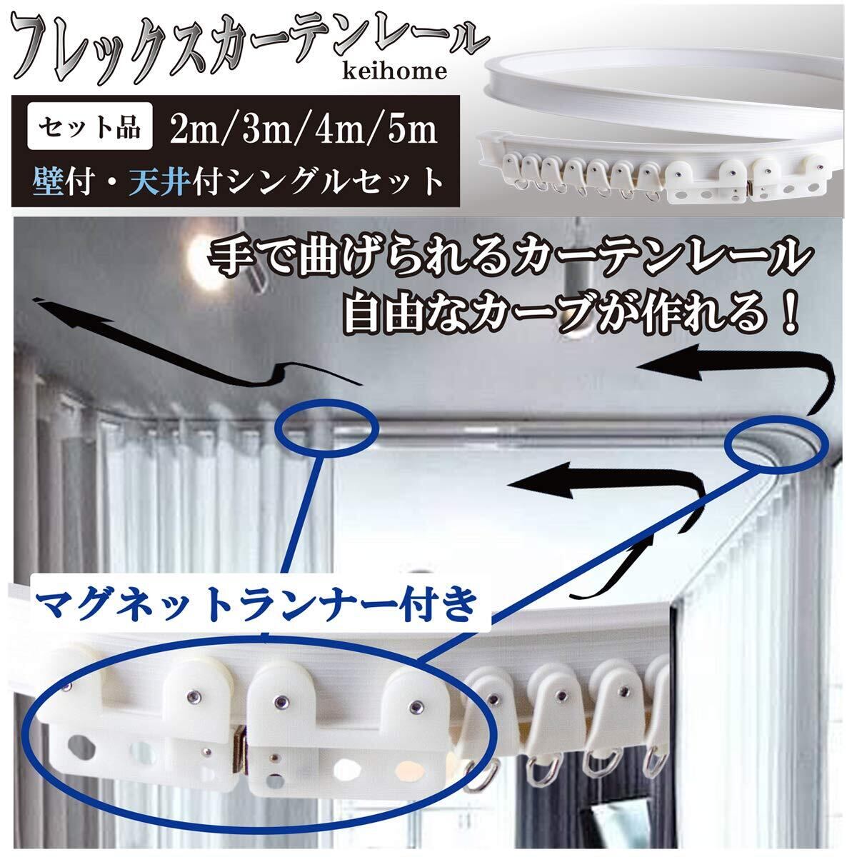 カーテンレール 曲がる 2m 3m 4m 5m 出窓 間仕切り シングル マグネットランナー付き keihome(4m)