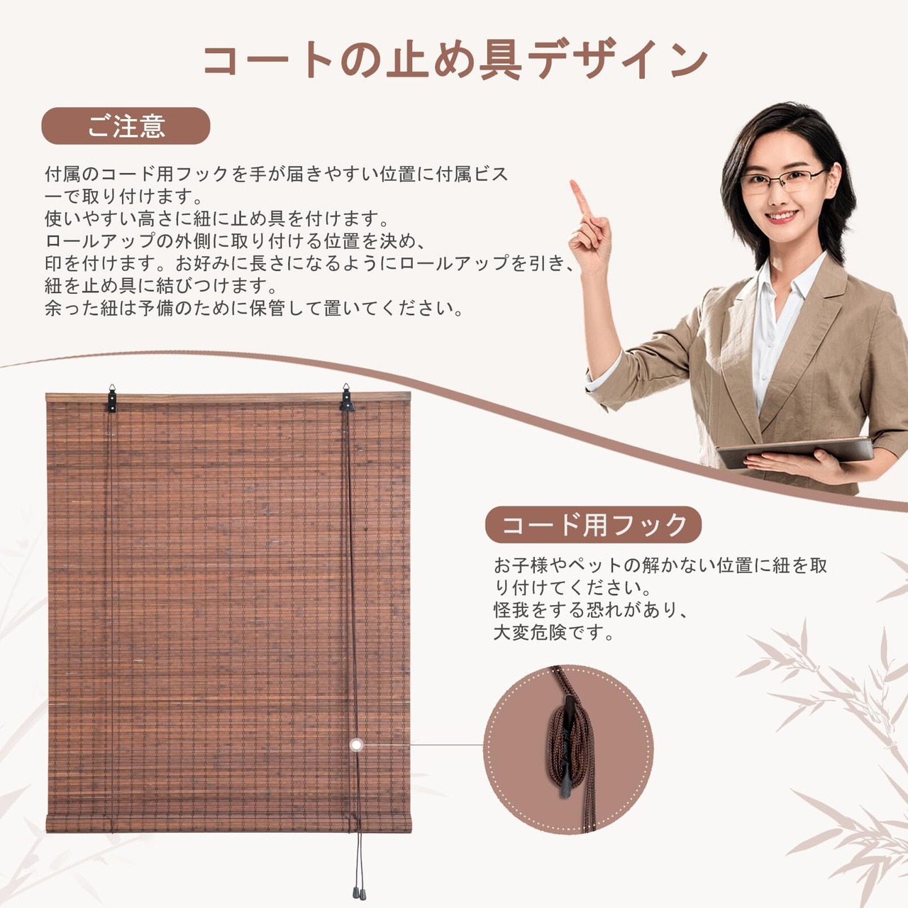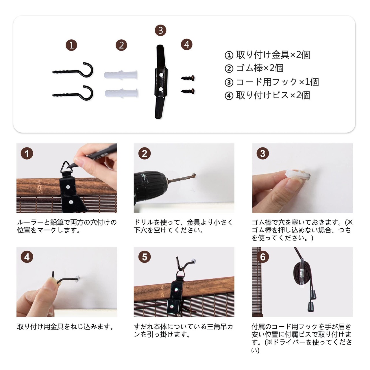 【取り付けが簡単】当社の竹ブラインドは、取り付けアクセサリーを含め、屋内および屋外の設置に適しています。ご注文の前に、設置タイプとサイズ情報を必ずご確認ください (設置図を参照)。