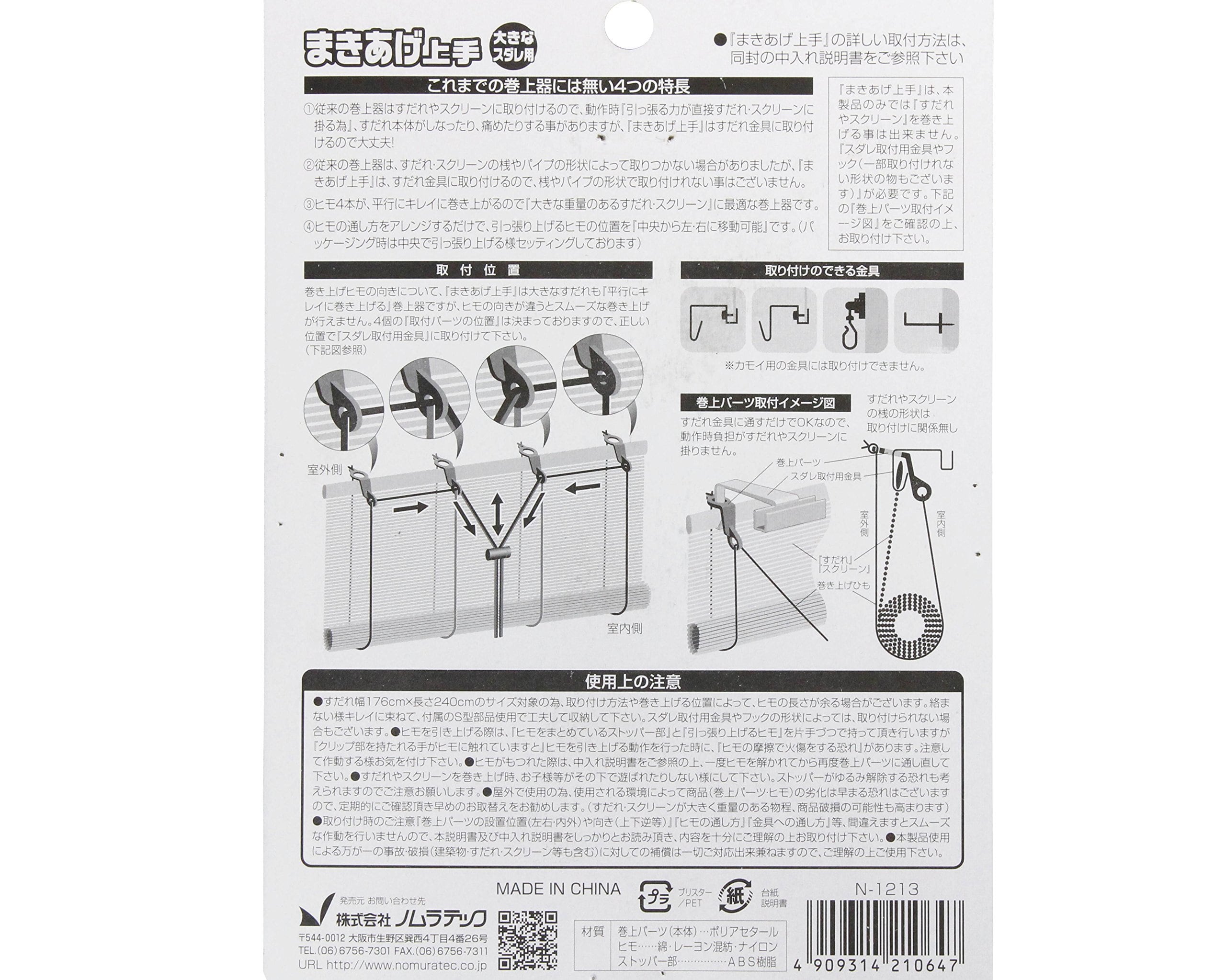 ヒモ4本で大きなすだれでもきれいに巻き上げできる。色々な桟の形に対応。