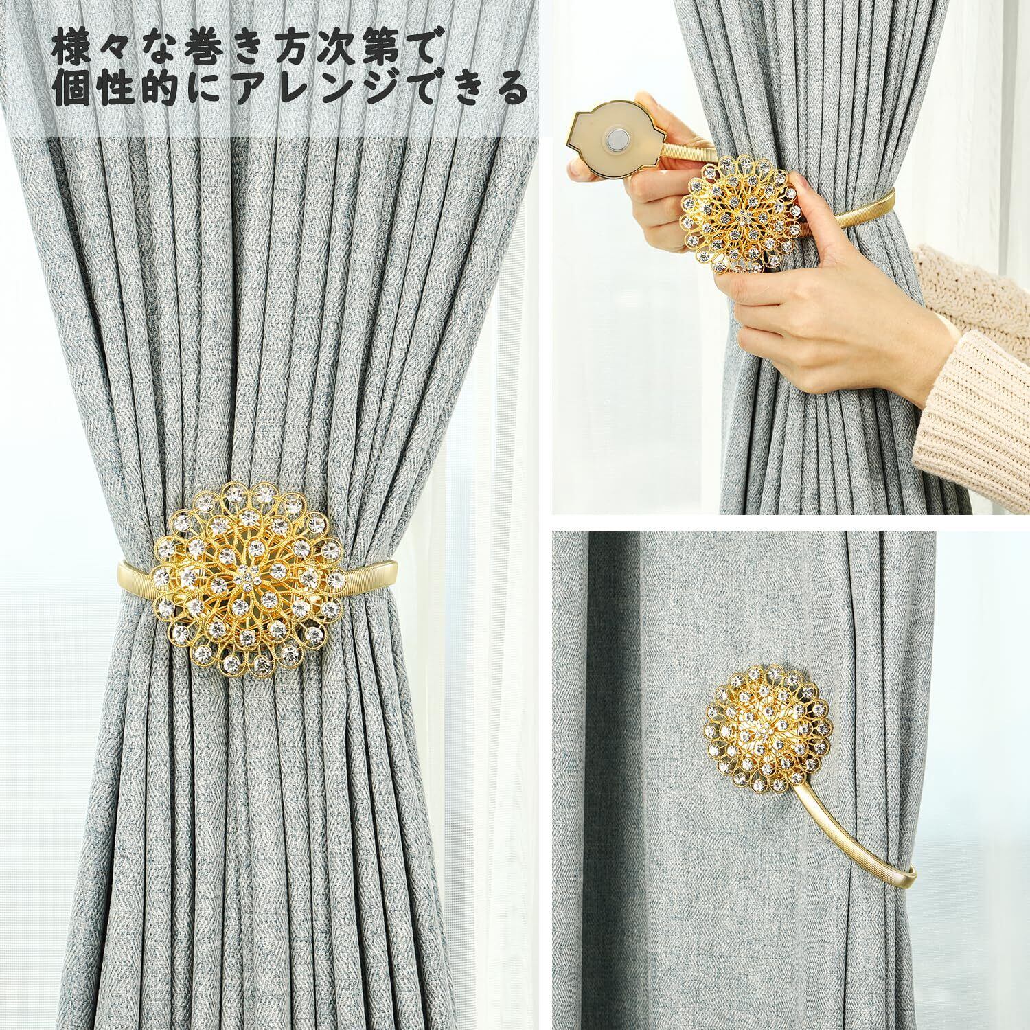 Lewondr カーテンタッセル 2つセット カーテン留め 窓掛け 房掛け マグネットタイプ クリスタル お花モチーフ アルミ合金製 飾り留め インテリア 部屋飾り クジャクのお花-ゴールド