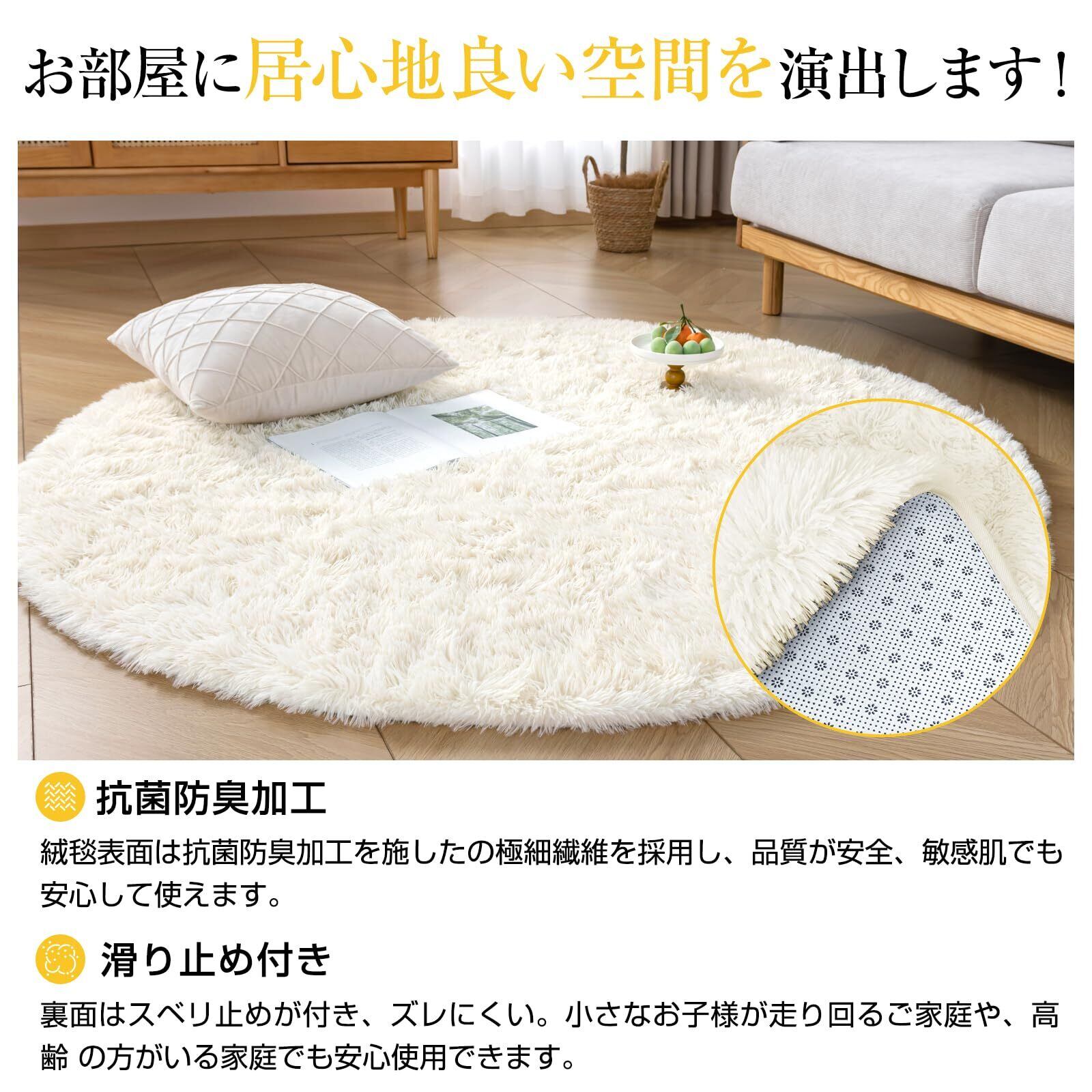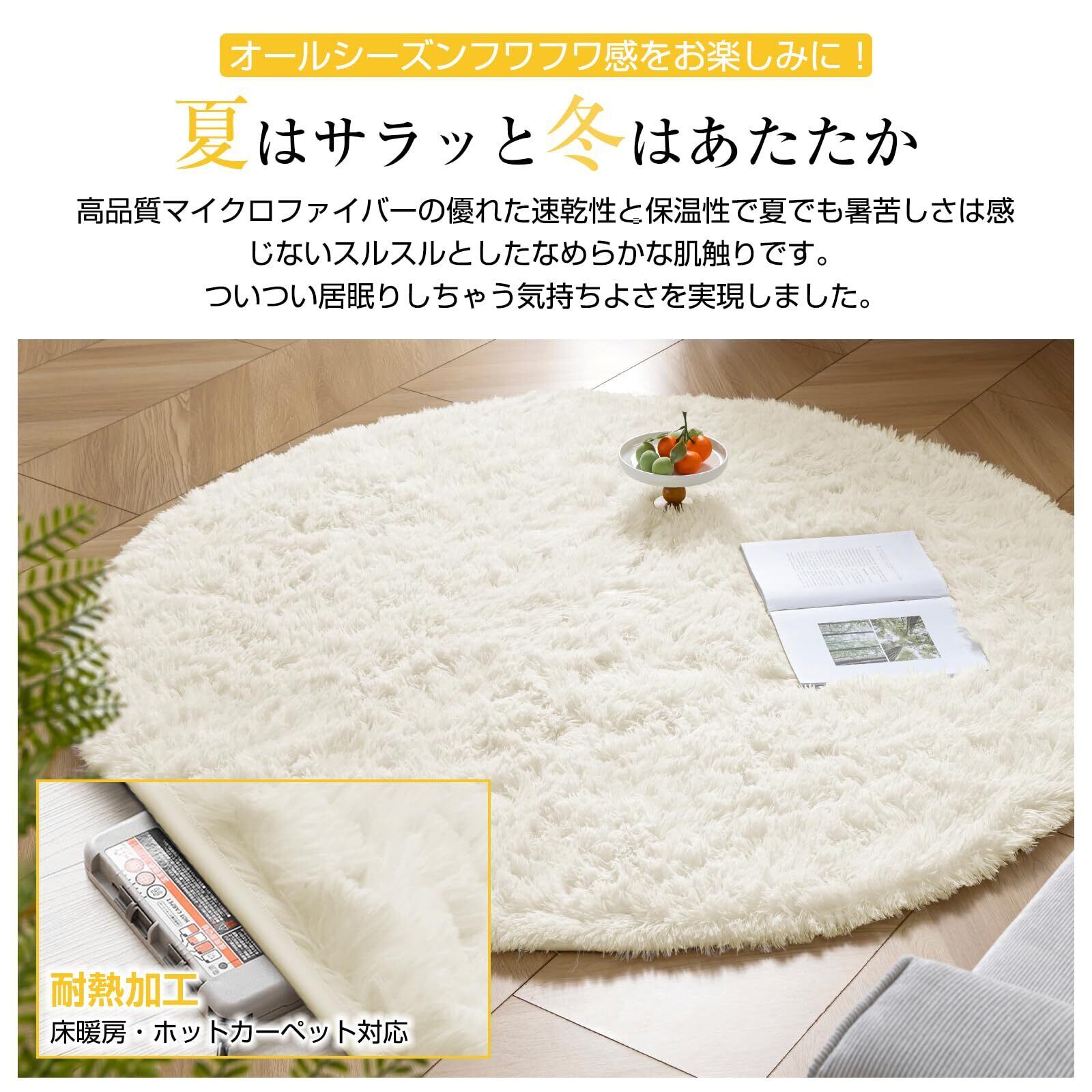 Keusnix ラグ カーペット ラグマット 円形 シャギーラグ 直径120cm 絨毯 ふわふわ 滑り止め付 洗える 肌触り優しい 防ダニ 抗菌 防臭 オールシーズン快適に使用 床暖房 ホットカーペット対応 アイボリー