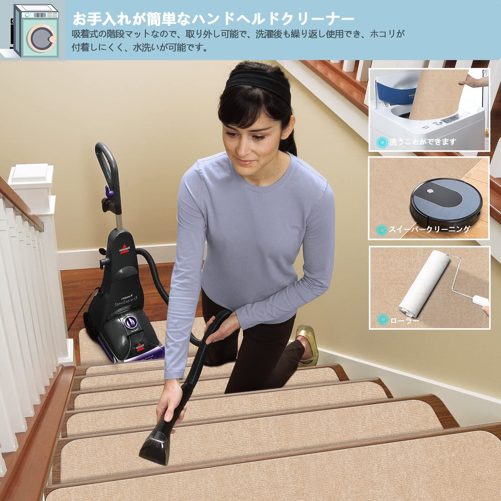 【清潔しやすく、繰り返し使用可能】使い方:床掃除後、製品の下のフィルムをはがして、マットを片側から押し上げ、階段にしっかりと吸着します。 デイリークリーナーでホコリや汚れをしっかりガード。 汚れたら、手洗いまたは洗濯機で洗濯してください。 水で洗える階段マットです。 何度も洗濯して乾燥させて繰り返し使えます。