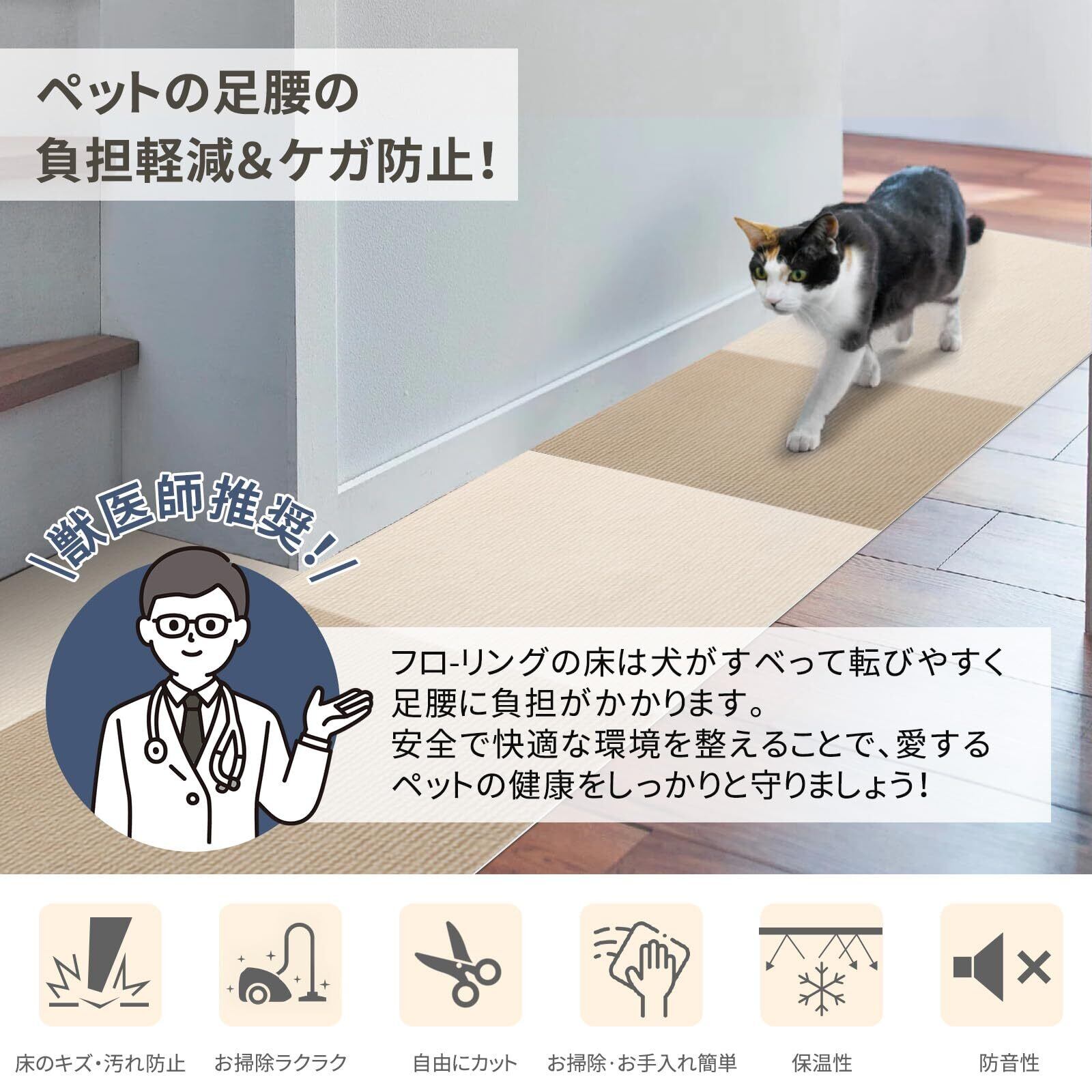 【厚さ25%UP、日常生活の安全をしっかりサポート】全体的に柔らかく、クッション性に優れた本製品は、足音や物の落下による衝撃音を効果的に吸収し、室内での静かな環境を実現します。特に、赤ちゃんやペット、そしてご高齢の方々にとって重要な関節への衝撃緩和機能を備えています。転倒や衝突時のダメージを最小限に抑え、安全で安心できる空間を提供します。また、独自の吸着技術により、床にしっかりと固定され、ズレにくいため安心してご使用いただけます。防音機能も併せ持ち、騒音を気にせず快適な生活をサポートします。