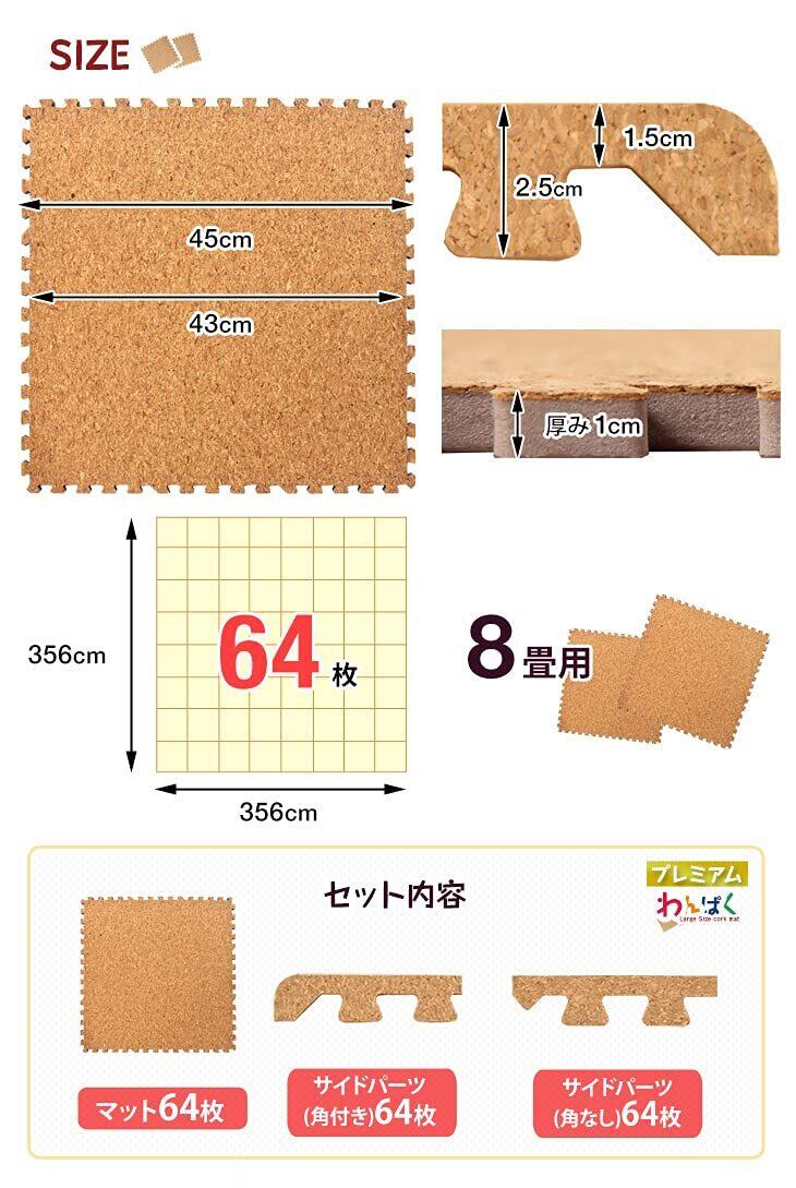 【サイズ】縦4列×横6列で敷いた場合 180×268cm(3畳) 幅45×奥行45×厚み1cm(1枚) 【セット内容】 コルクマット24枚 サイドパーツ(角付きパーツ24本 、角なしパーツ24本)