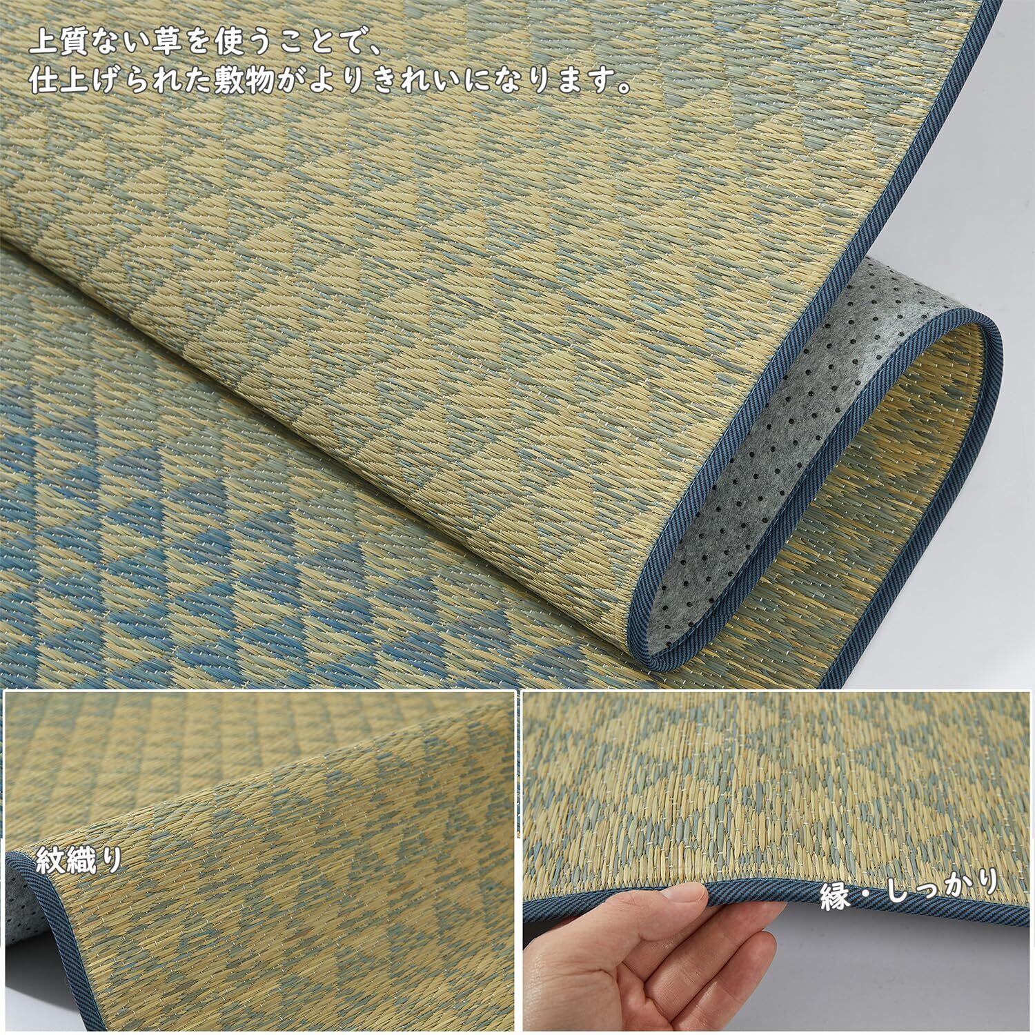 【仕様】サイズ:180x180cm;厚み:約4mm;色:ブルー系グラデーション;表地:い草;裏地:ポリエステル不織綿(滑り止め加工付き);縁:ポリエステル;織り方:紋織り;重量:2kg;備考::抗菌防カビ処理実施。