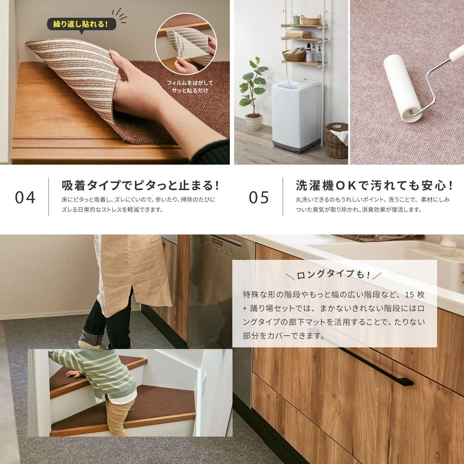 吸着で滑りにくい薄手の階段マットです。裏面の保護フィルムを剥がして置くだけで、滑りにくくピタッと敷くことができます。洗濯機で丸洗いできるので、いつでも清潔にお使いいただけます。