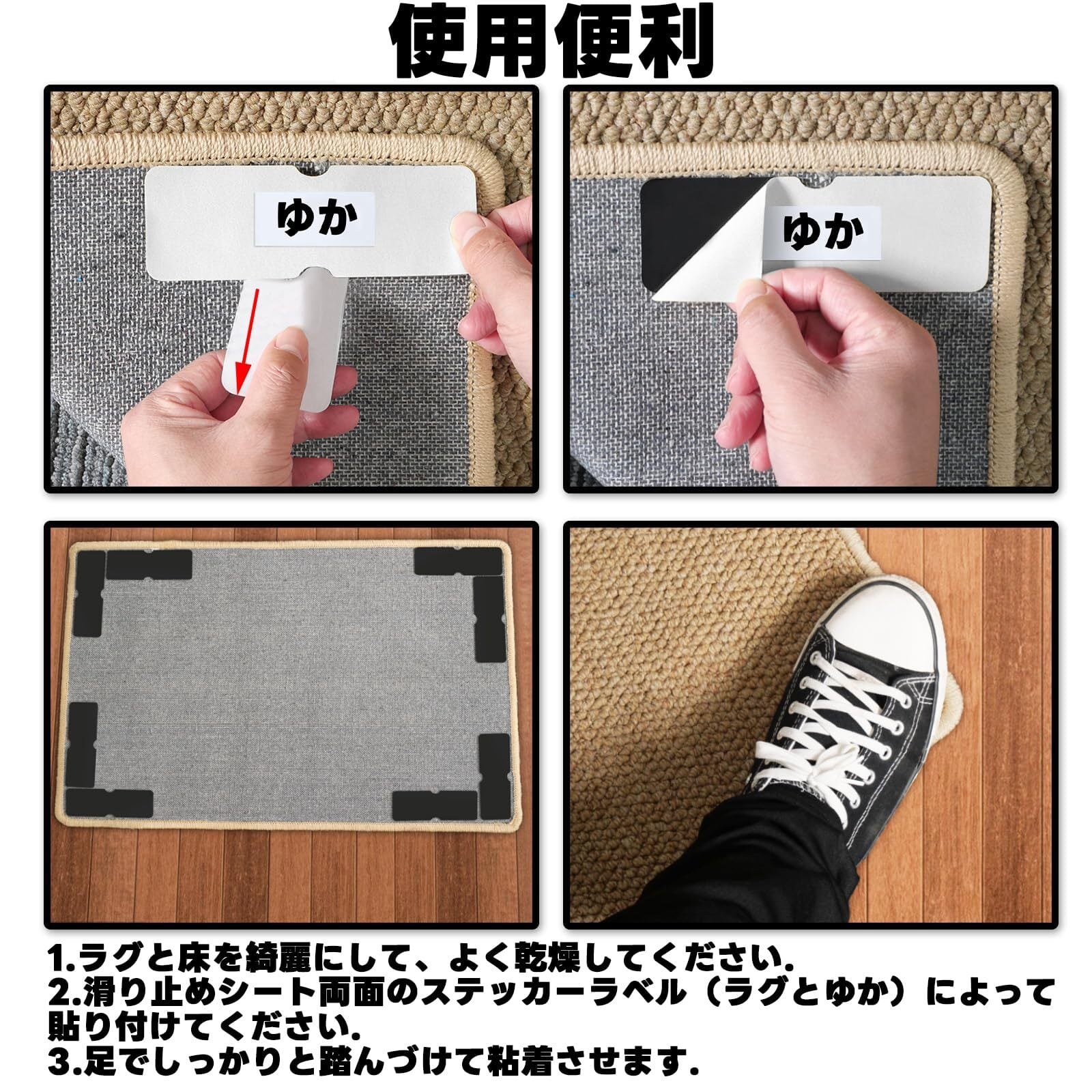 【幅広い用途】カーペットやラグ、キッチンマットの下に敷くだけでカーペットのずれを防止し、しわが出にくくなります。また、マットによる滑り落ち、転倒を防ぐ同時に掃除もしやすくなります。テーブルクロスや、ソファーカバー、ラグ、玄関マットおよび布団、マットレスの下敷きにも適しています,取り外すことができるシートで貼ってもマットは移動や掃除するとき、床にノリ跡なども残りません。床や敷物に損傷しません。