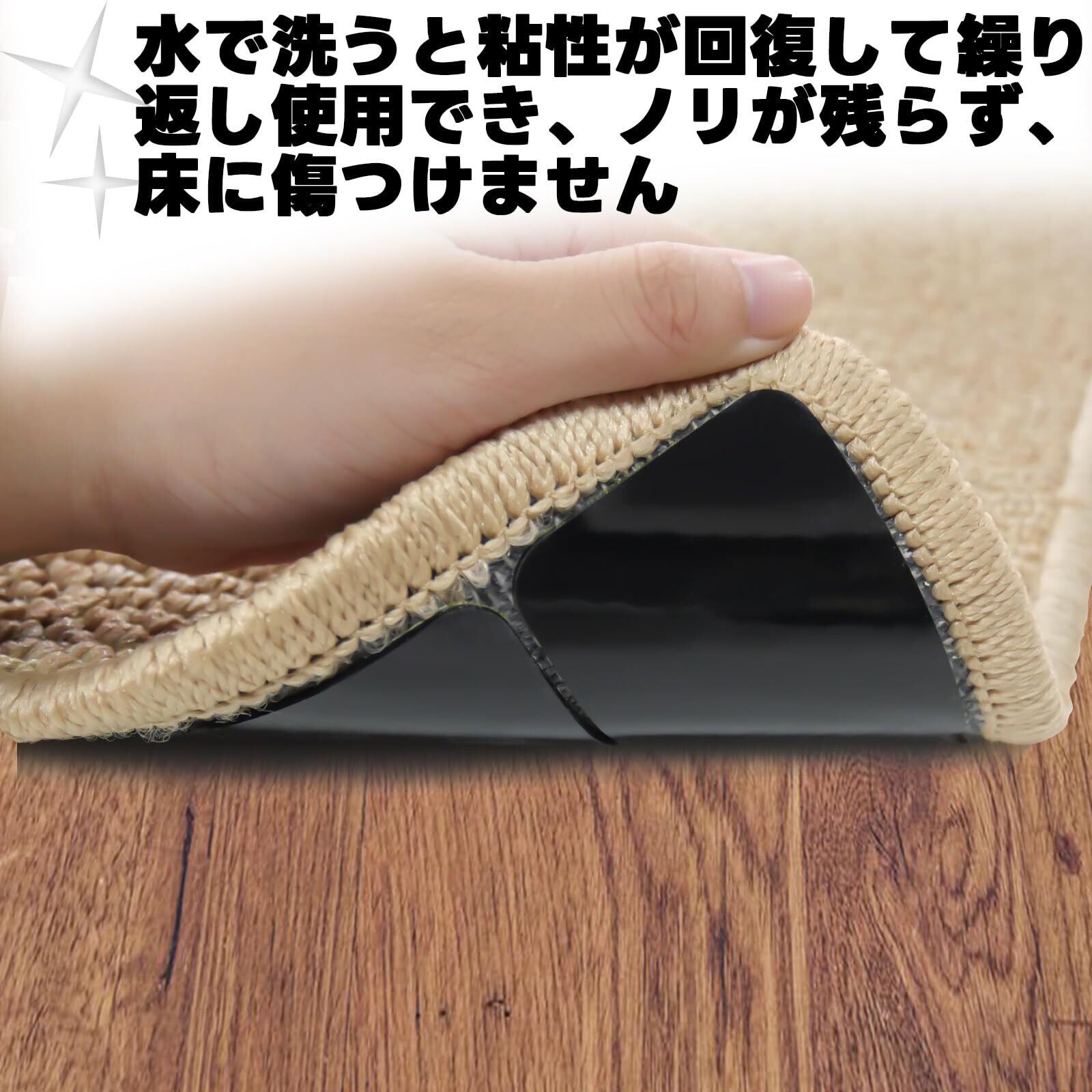 【繰り返し利用でき&床に傷つけない】ゆかの側は水で洗うと粘性が回復し、ほこりなどが付いても濡れた布で拭き取ったり、カーペットに貼ったまま水で洗ったりすることができます。自然に乾燥させてから、吸着性も落ない、繰り返して利用できます。剥がす時にノリが残らず、床に傷つける心配がなく、賃貸にお住まいの方でも安心してご使用いただけます。ラグの側の両面テープはメッシュ加固で従来品より粘着力がもっと強くなります。