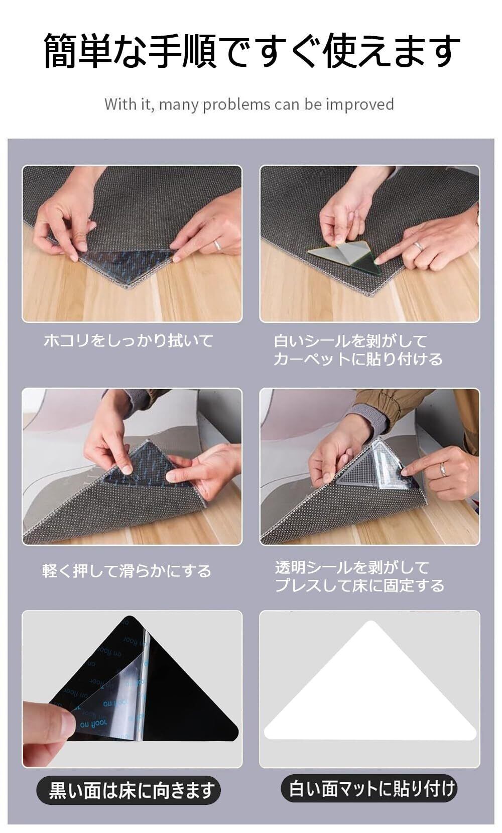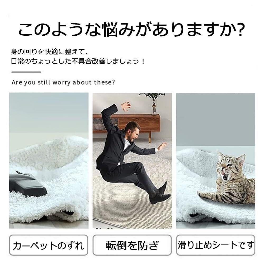 【使用便利】使用もとても便利でカーペットマッの は。シールを剥がして張るだけと。ラグパッドを床にしっかりと貼り付けます。最後に力を加えてしっかりと貼り付けます。最適な性能を発揮させるために、貼り付ける前にラグと床の接触面を十分に清掃することを忘れないでください!様々な形のカーペットやソファマットなどに対応出来ます。ハサミで任意の大きさにカットでき、簡単DIYを楽しみいただけます。小さいマットから大きなカーペットまで、アイディア次第で様々な用途に活用出来ます。