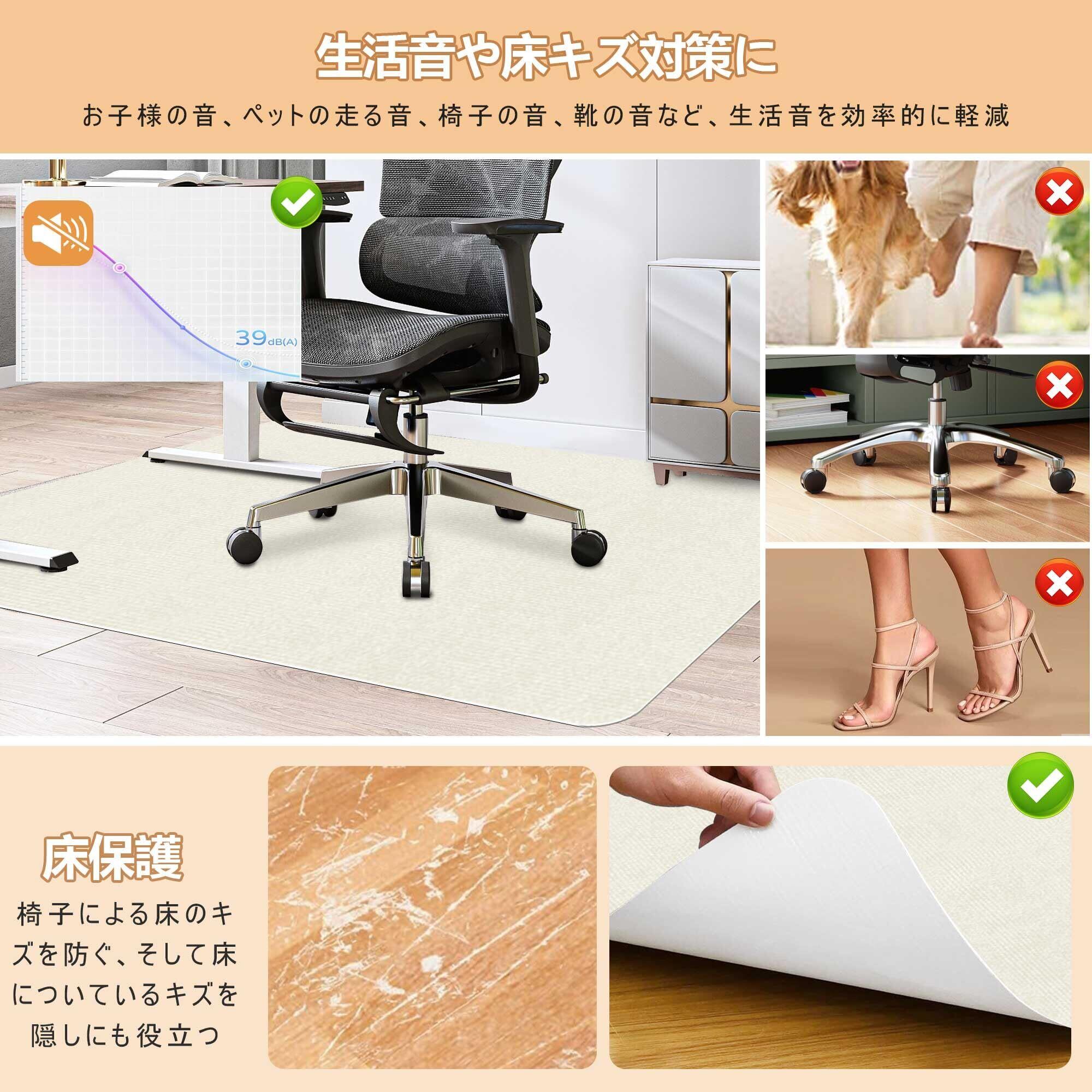 【騒音を軽減・傷防止デスクチェアマット】キャスターの動 きによるノイズを効果的に低減し、階下の居住者と静かで快適な環境を作り出す、吸音・ノイズリダクションのチェアマットです。 ;厚さは4mmで、家具やキャスターによる傷から床を保護することができ、新築住宅や賃貸アパートに適しています