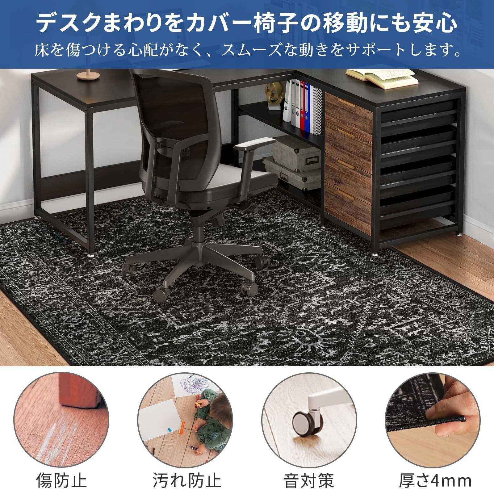 チェアマット デスクマット ゲーミングマット 150×190cm 滑り止め 大判 デスク 床保護 傷防止 フローリング オフィスチェア 騒音対策 床暖房対応 オールシーズンで使える ラグ ズレない【 ブラック】