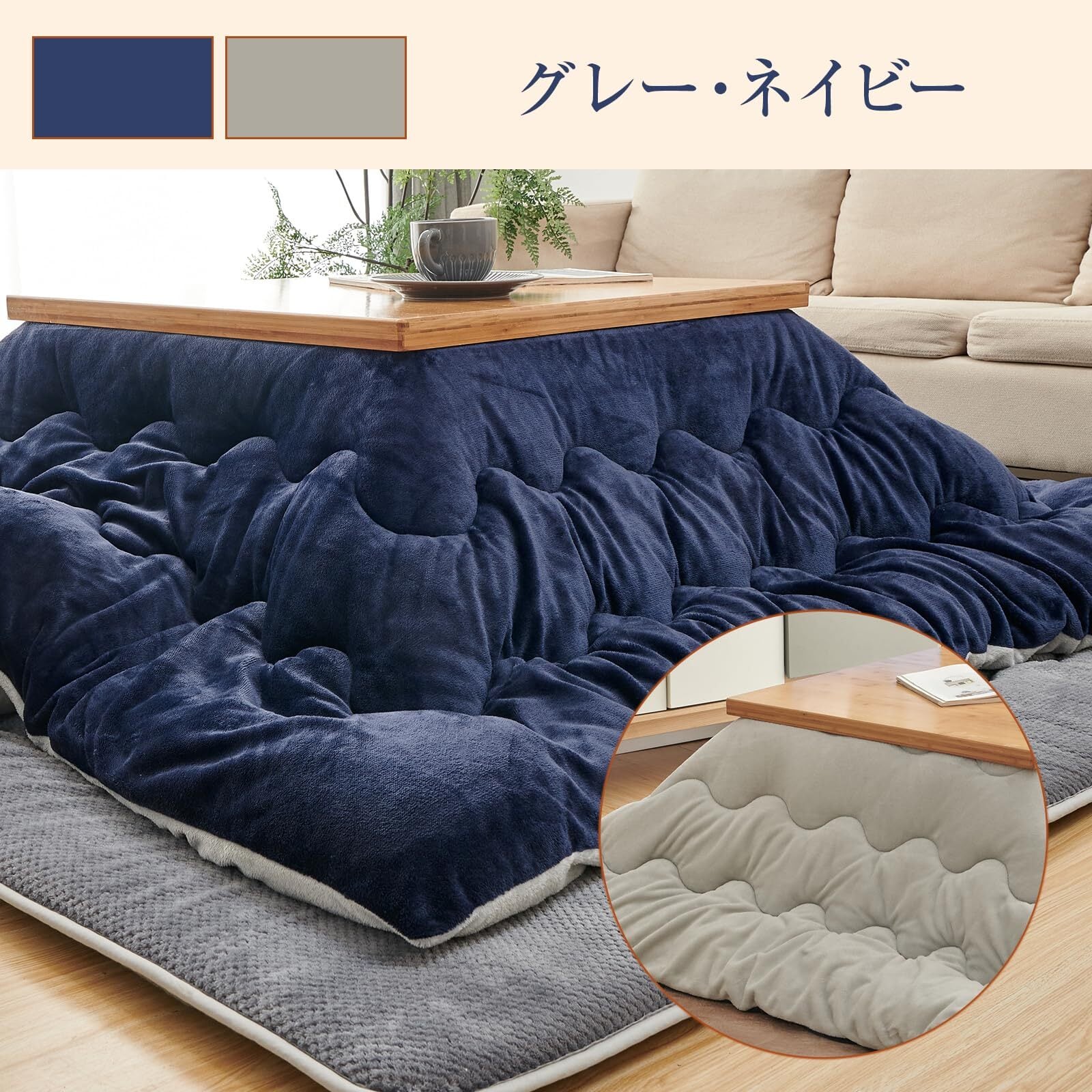 【両面フランネル生地・リバーシブル用】表も裏もなめらかでソフトな肌さわり、保温性に優れるフランネル素材を使用して、冬のこたつに入るときのヒャッとを軽減してくれます。両面は異なるスタイルなので、お部屋の雰囲気や気分でお気軽に使い分けしていただけます。