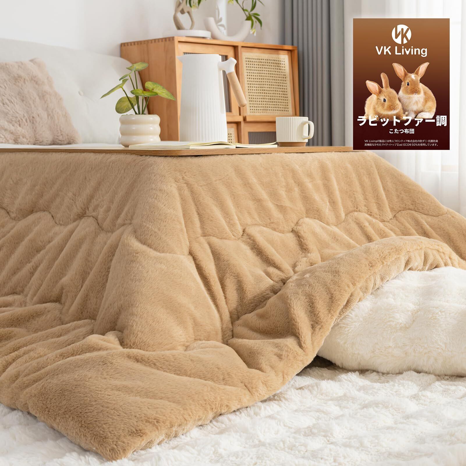 VK Living こたつ布団 長方形 単品185×235cm 【ラビットファー調・極上の暖かさと肌触り】 リバーシブル 両面使える 3層構造 エアコンドライ綿 保湿美肌加工 保温性 丸洗いOK 【静電気99%抑制】 毛足10㎜ 毛抜けない ベージュ