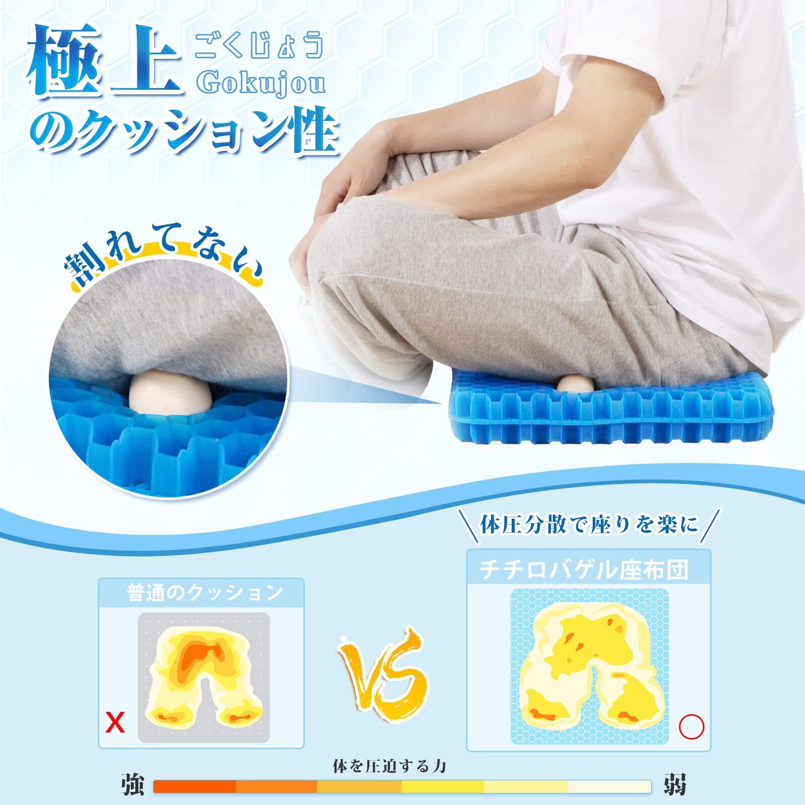 【極上・クッション性】厚い分体圧分散効果も顕著、ゲルの弾力性で水面に浮くような座り心地を実現。長時間座ってもおしりが痛くなりにくい。座布団としてもお使いいただけます。