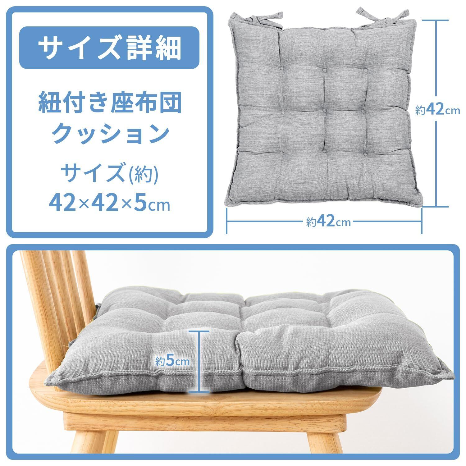 AIFY 座布団 椅子 クッション 厚め 紐付き 2枚セット ふわふわ 麻風 無地 オールシーズン シートクッション ダイニングチェア用 42x42x5cm グレー 2枚セット