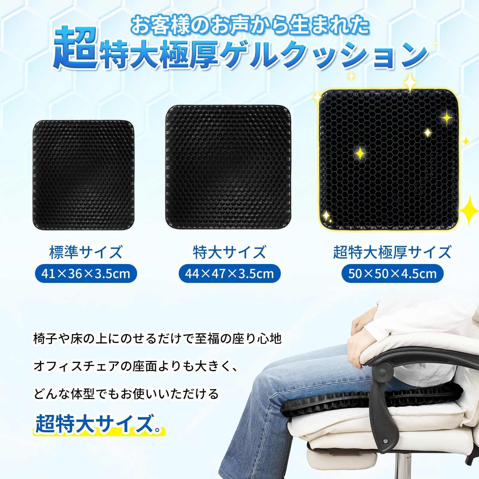 【特大極厚ゲルクッションならではの使い勝手】オフィスチェアの座面を丸ごとカバーできちゃうほどの特大極厚ゲルクッションです。サイズ:約50×50×4.5㎝です。特大極厚サイズゲル座布団をお求めの方はぜひお試しあれ。