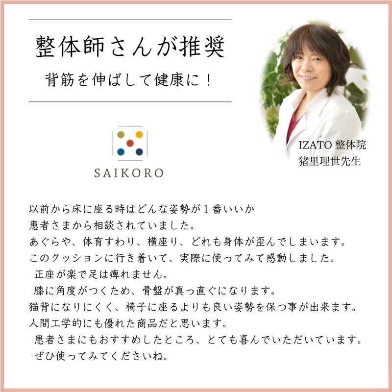 「彩転(さいころ)」は、どこか落ち着く“和”のテイストを取り入れた商品で、彩りがある毎日を提案するブランドです。 「正座が楽になるクッション」 法要やお稽古事などで長時間正座をしなければならない時ってありますよね。 正座したときの体重を、しっかり受け止めてくれるので、もう足がしびれたり、痛くなったりすることから開放されます。 さらに、このクッションを使うと自然と背筋が伸びて、立っている時に近い理想的な姿勢をキープできるから、長時間座っても楽なんです。 小さくかわいいサイズで、場所を選ばず必要なとき気軽にお使いいただける「正座が楽になるクッション」。 正しい姿勢で、健康的な体を手に入れてください。 【サイズ】約幅20×奥行20×高さ20cm 【素材】表地:綿100%、詰め物:ポリエチレンパイプ100% 【生産国】日本製