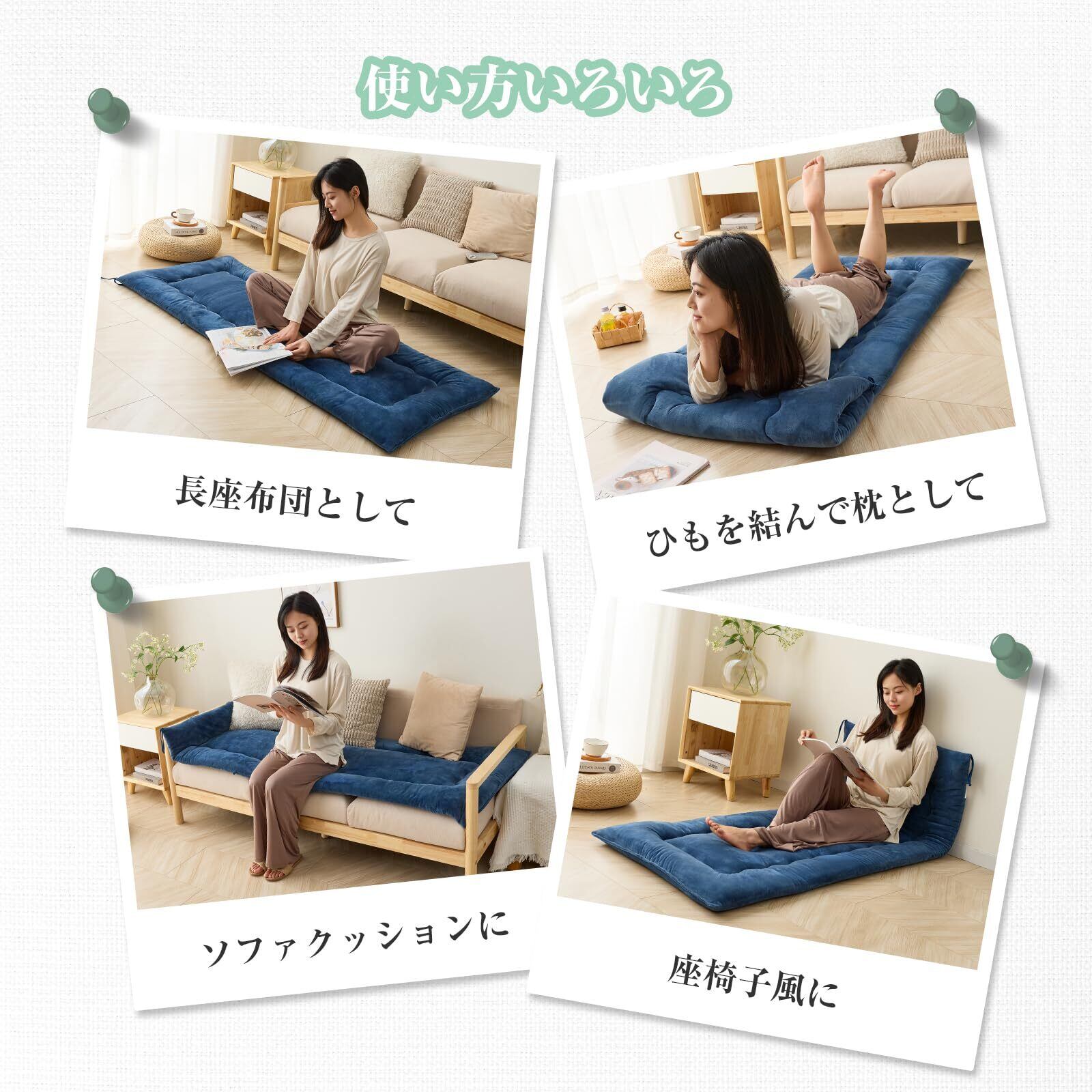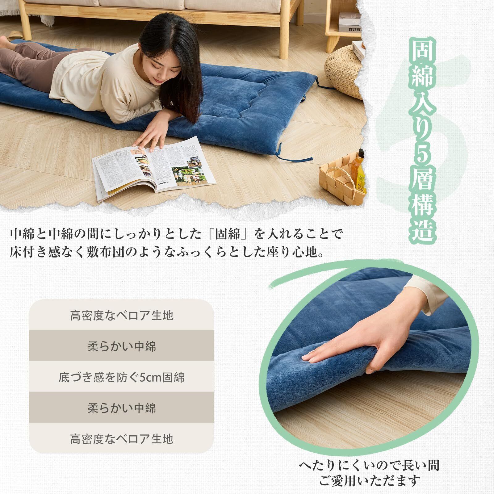 【多様な用途】ふんわりと心地いいやわらかさでリラックスタイムにぴったり。座布団として使えば2人以上が座れるので来客時にもおすすめです。ソファの上に乗せてソファクッションとしても使えます。小さく折り返して紐を留めれば枕代わりになります。肌触りが心地よい眠りに誘います。壁にくっつけて座椅子風クッションとして。読書タイムなど、サッと広げて簡単に使えます。車内使いにも便利です。【軽くて持ち運びらくらく】丸めて紐で結べば、お部屋の隅やタンス横、クローゼットにも!省スペースに収納が可能です。持ち運びも簡単でどこにでも持っていくことが可能です。