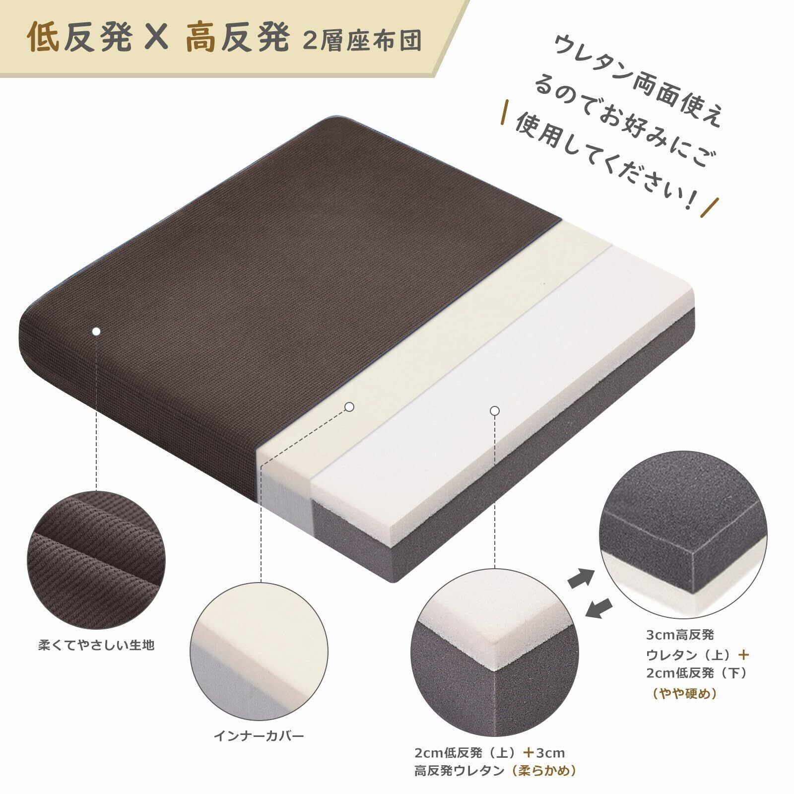 【2層構造】2cm低反発ウレタン+3cm高反発ウレタンの2層構造で5cmの薄さでよい座り心地をあたえ、長時間使用してもへタレにくく、2つの素材の長所を生かしました。