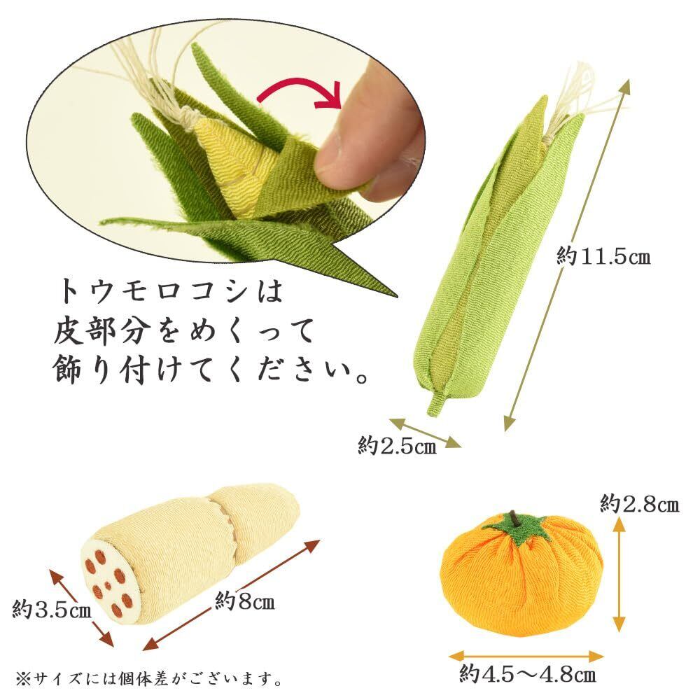 【各サイズ】ほおずき:幅5×奥行3.5×高さ4.5(cm)、ぶどう:直径5×高さ7(cm)、とうもろこし:直径2.5×高さ11.5(cm)、蓮根:直径3.5×高さ8(cm)、みかん:直径4.5~4.8×高さ2.8(cm)