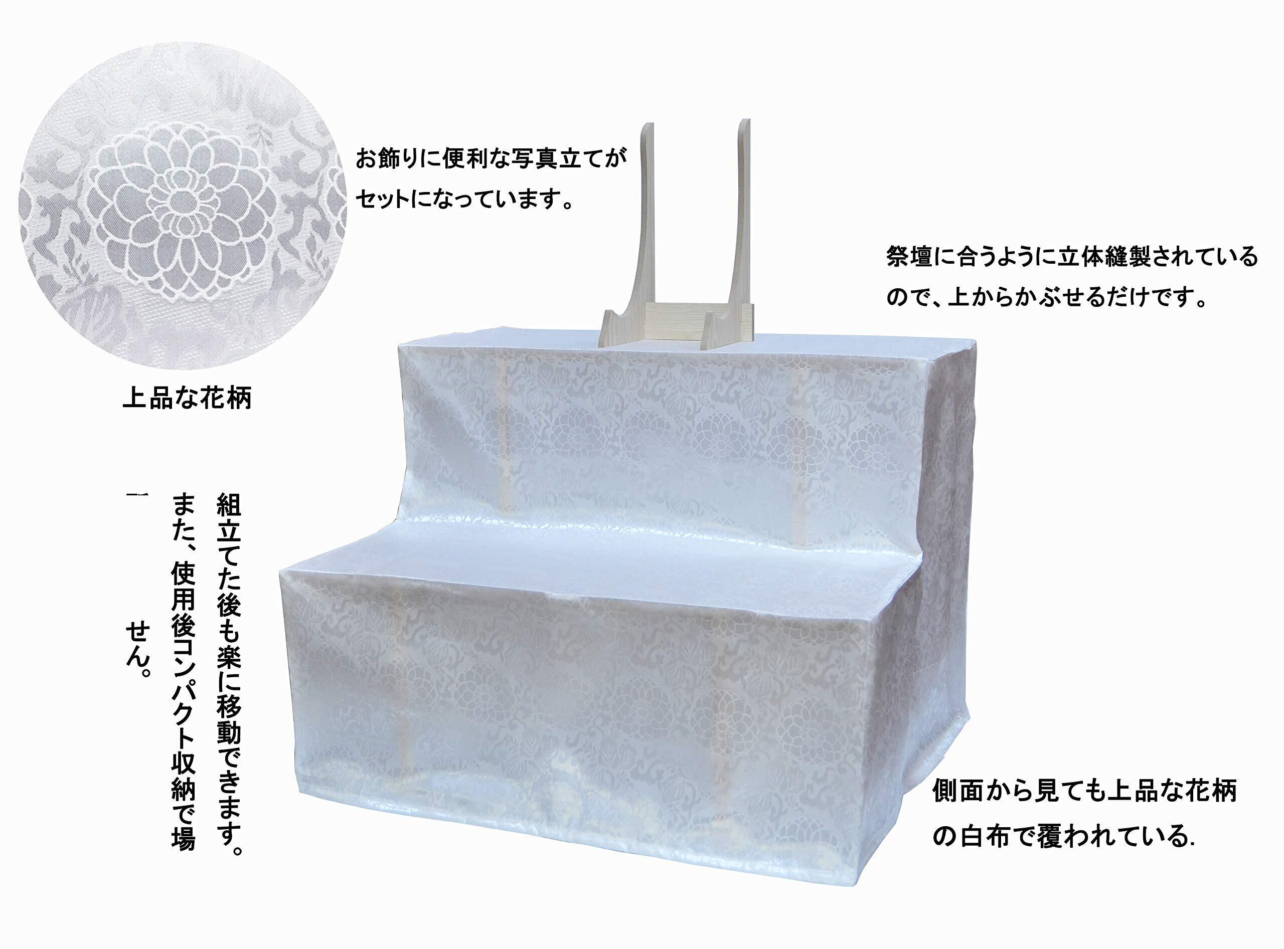 カバー付:白布を使い、祭壇に合うように立体縫製されているので、上からかぶせるだけで易しくかけられます。脇にも白布がしっかりかかるので、横から見ても本体の骨組み見えないすっきりとした仕上がりになります。