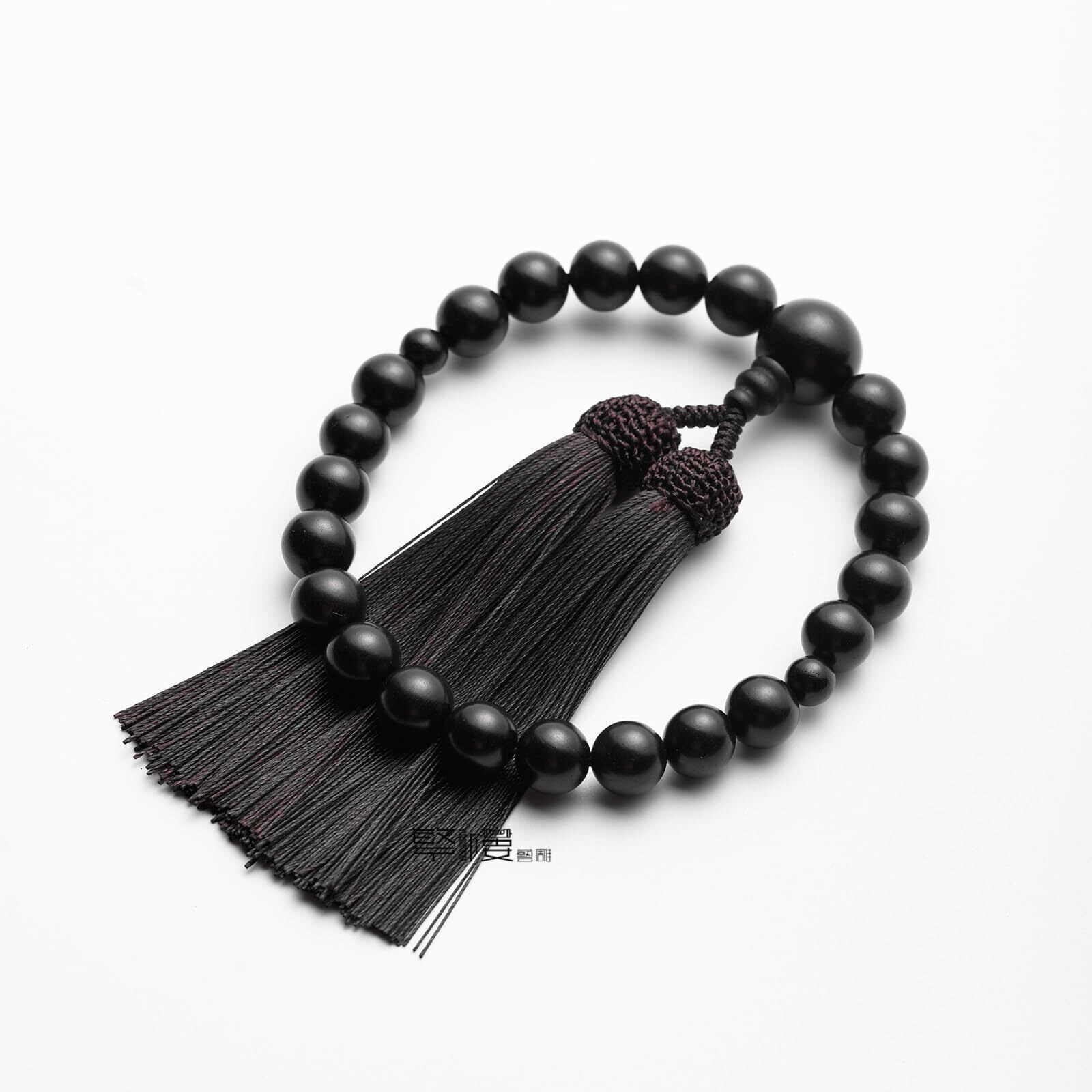 ❥念珠の材料:念珠は全部本場の黒木から作られ、中には18ミリメートルの親珠を1個、12ミリメートルの主珠を22個、また8ミリメートルの天珠を2個含み、共に25個となり、お客様の都合のため、念珠袋(15cm*9.5cm)も付けます。