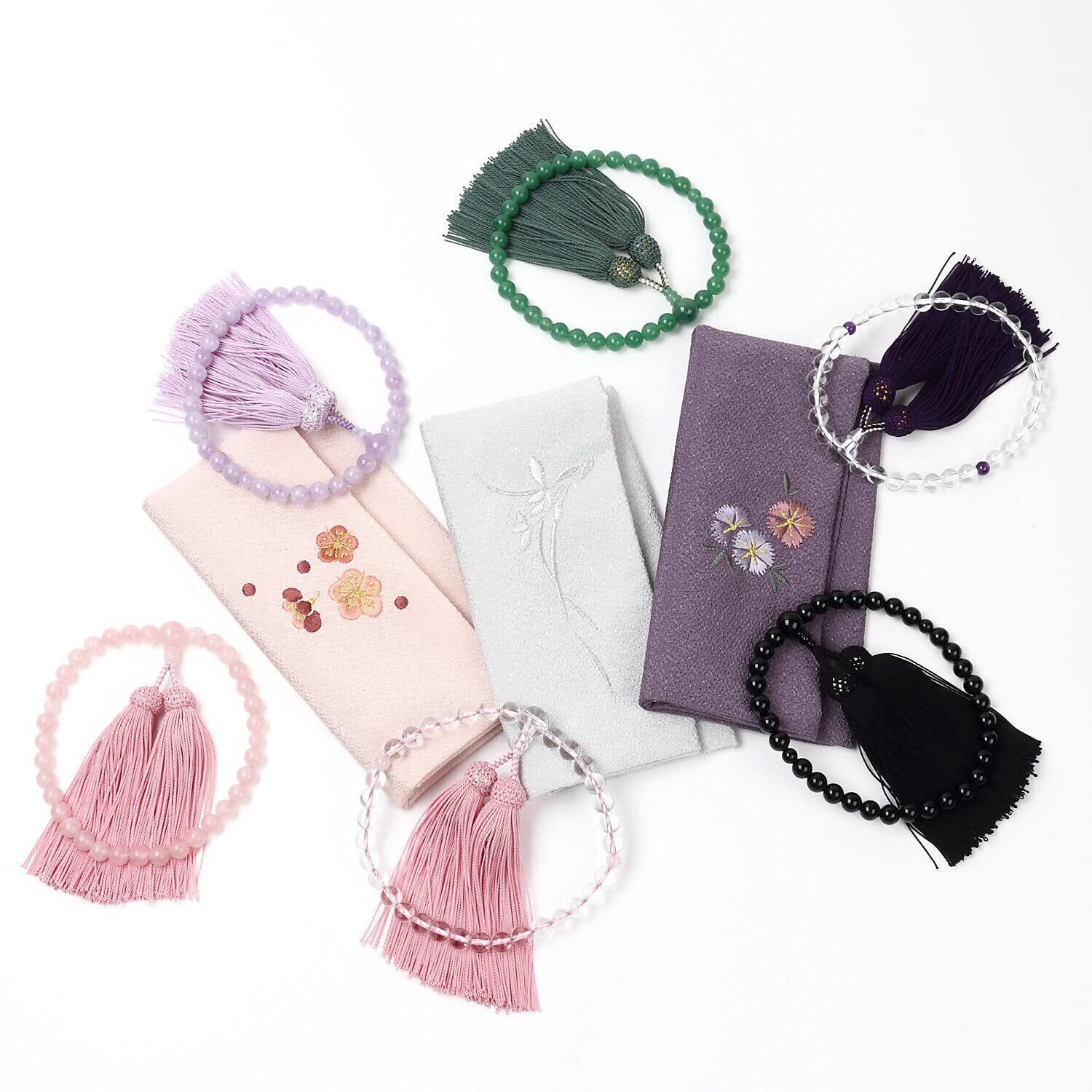 女性用 数珠袋 レディース 二つ折 ちりめん 刺繡入 京念珠 念珠入れ ポーチ ケース 外箱付 日本製/紫 パープル ( 撫子 )