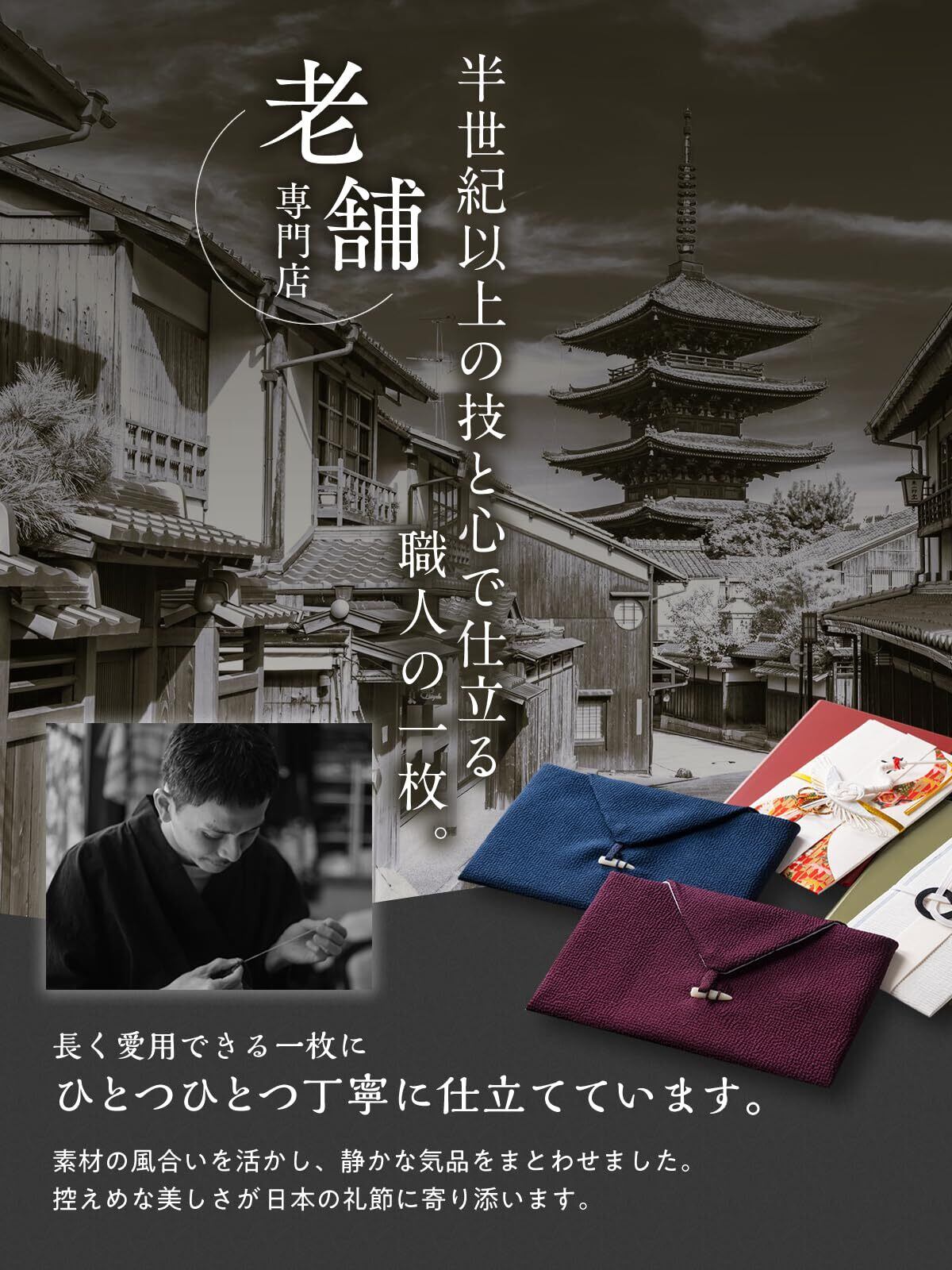 葬祭のプロも推奨 – 冠婚葬祭マナーBOOK付き 厚生労働省認定 葬祭ディレクター1級・神崎忍氏 推奨の袱紗。 「金封を袱紗で包むことは、相手を大切にし、礼儀を尽くす意味があります。」 初めての方でも安心して使えるよう、冠婚葬祭のマナーBOOKを付属。 正しい使い方を学びながら、しっかりと礼儀を尽くせる(初めてのふくさ)としてもおすすめの袱紗です。